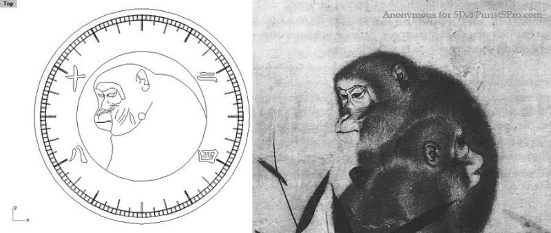 The monkey motif was selected because his son was born in the Chinese year of the Monkey. As for the rational behind the unusual choice of numerals: "I don't want to clutter the watch with too many numbers on the dial, the basic Shimoda has too many in my opinion. Most watches have 12, 3, 6 and 9." So in order to make the watch unique, 2, 4, 8 and 10 were used instead, and in Chinese characters.