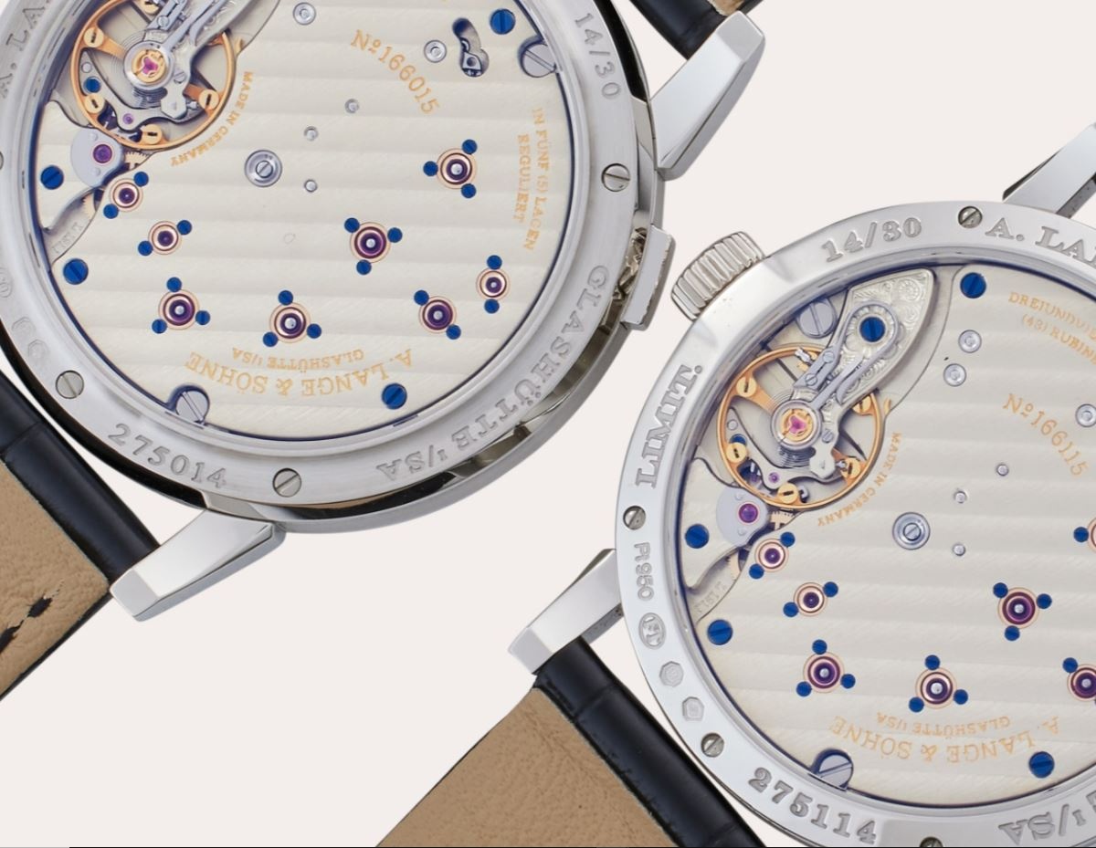 With that early history in mind, look at the photo below, which is from the upcoming Sotheby's auction of the 181.826/191.826 set from 2024.** The LE number, caseback number, and movement number appear to be deliberately paired in a way that ALMOST reflects the original relaunch numbering scheme, with the 110000 difference. In the example below, if you subtract 109000 (unfortunately not 110000) from each of the caseback numbers below and then add 1, you get the movement numbers, which match the LE number. LE # 14/30 shown below has caseback number 275014 and movement number 166015 in one watch, and caseback number 275114 and movement number 166115 in the other watch.
