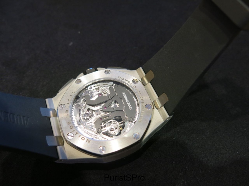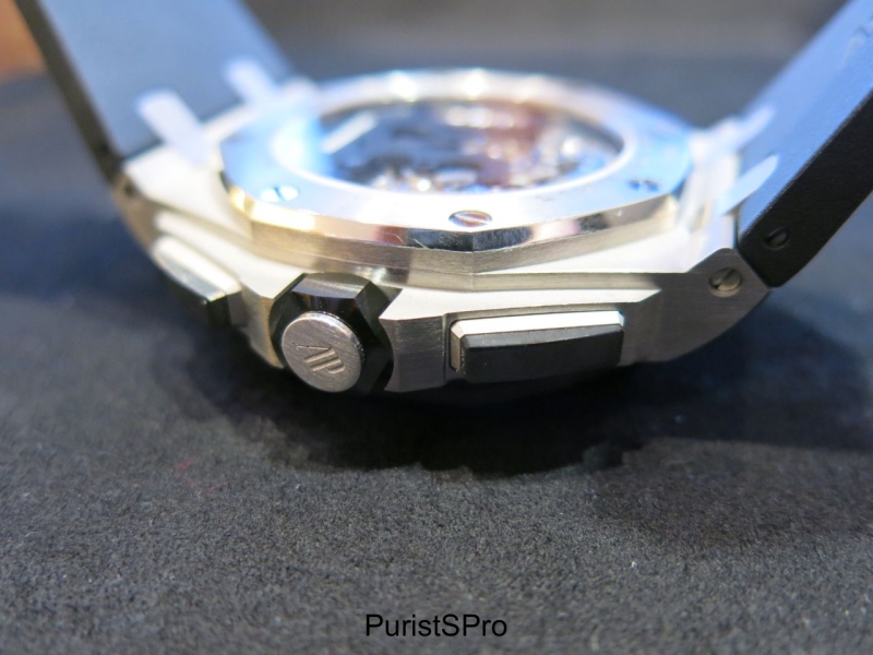 I was told this watch is a blend of the new and old style 42mm Offshore. I certainly see it as more similar to the older style, as it has the rubber pushers and old crown guard assembly. The open caseback is the obvious connection to the newer style Royal Oak Offshore collection.