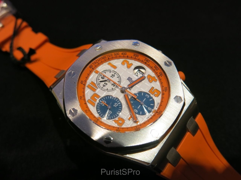 These Limited Edition Royal Oak Offshores include several straps. This white gold sample was mounted on orange rubber. Orange and dark blue hornback straps are also included. Lastly, I saw a dark blue rubber strap that will be available.