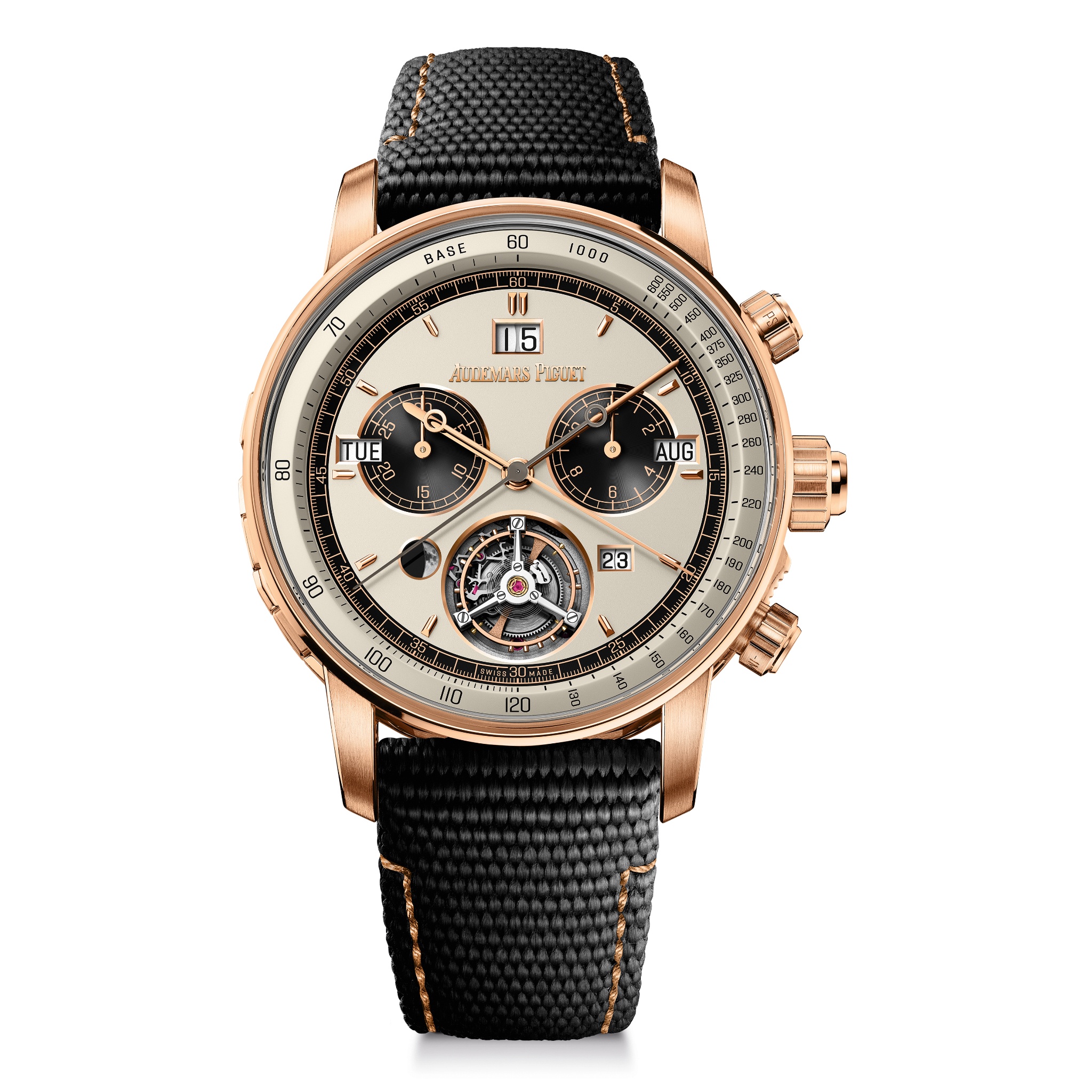“Audemars Piguet” signature inspired by historical documents at 12 o'clock.