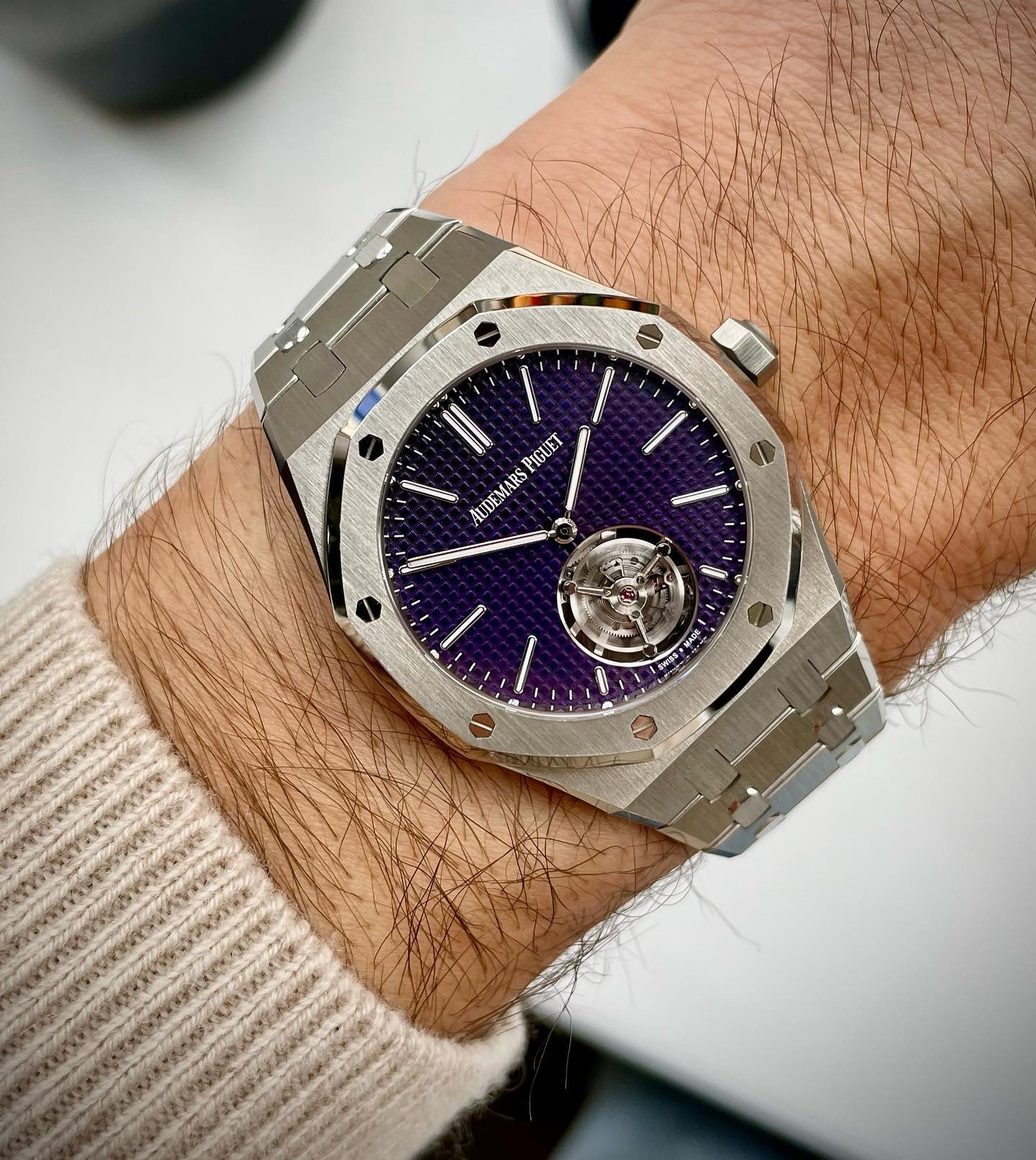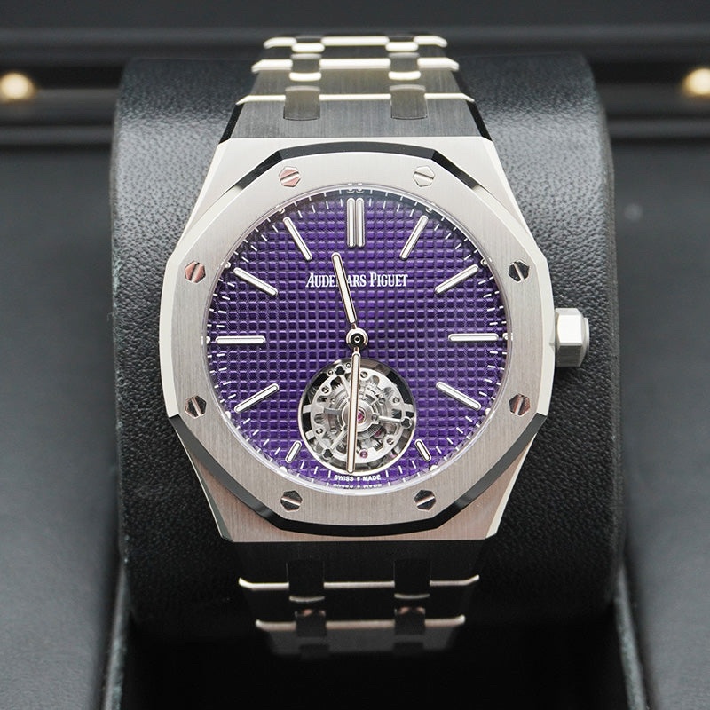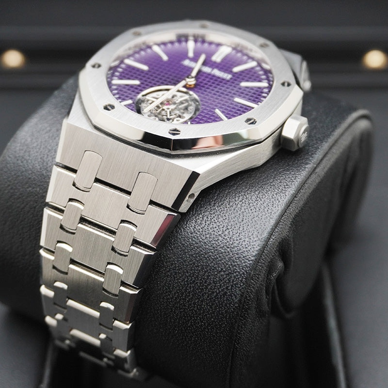 Plum dial with “Petite Tapisserie” pattern, white gold applied hour-markers and Royal Oak hands with luminescent coating.