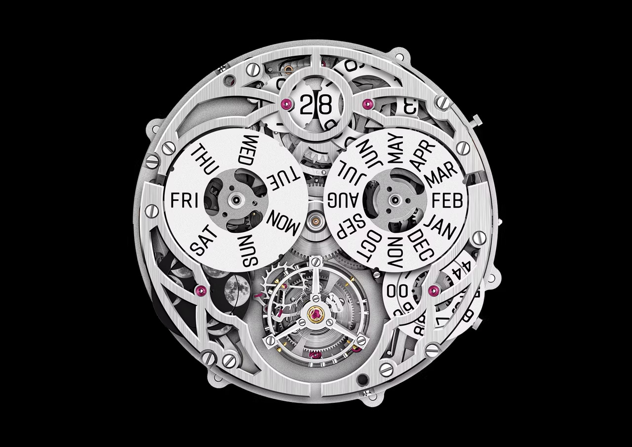Calibre 5133 (2.75 hz 19800 vph): Perpetual calendar with day, date, astronomical moon, month, leap year, night and day indication, hours and minutes.