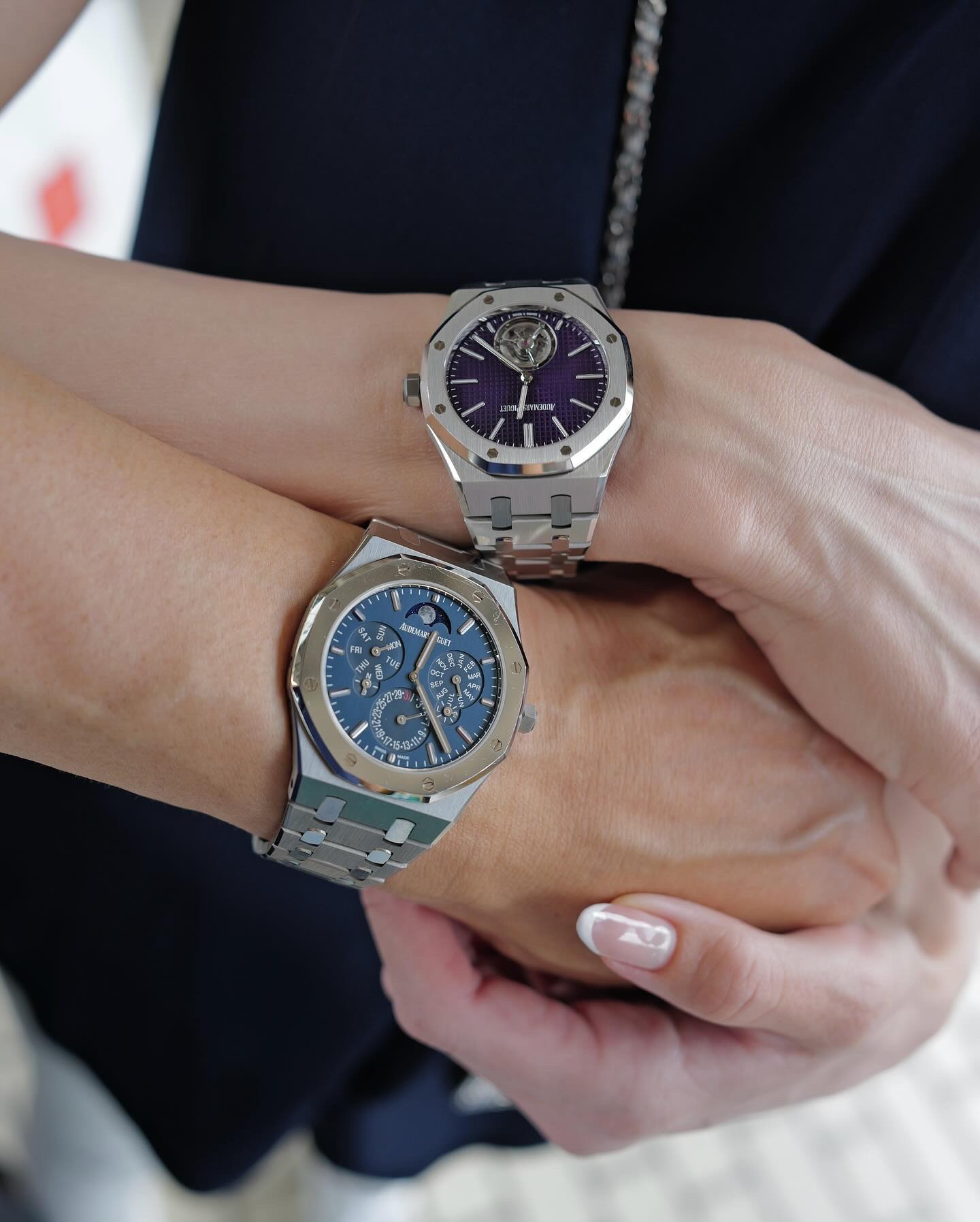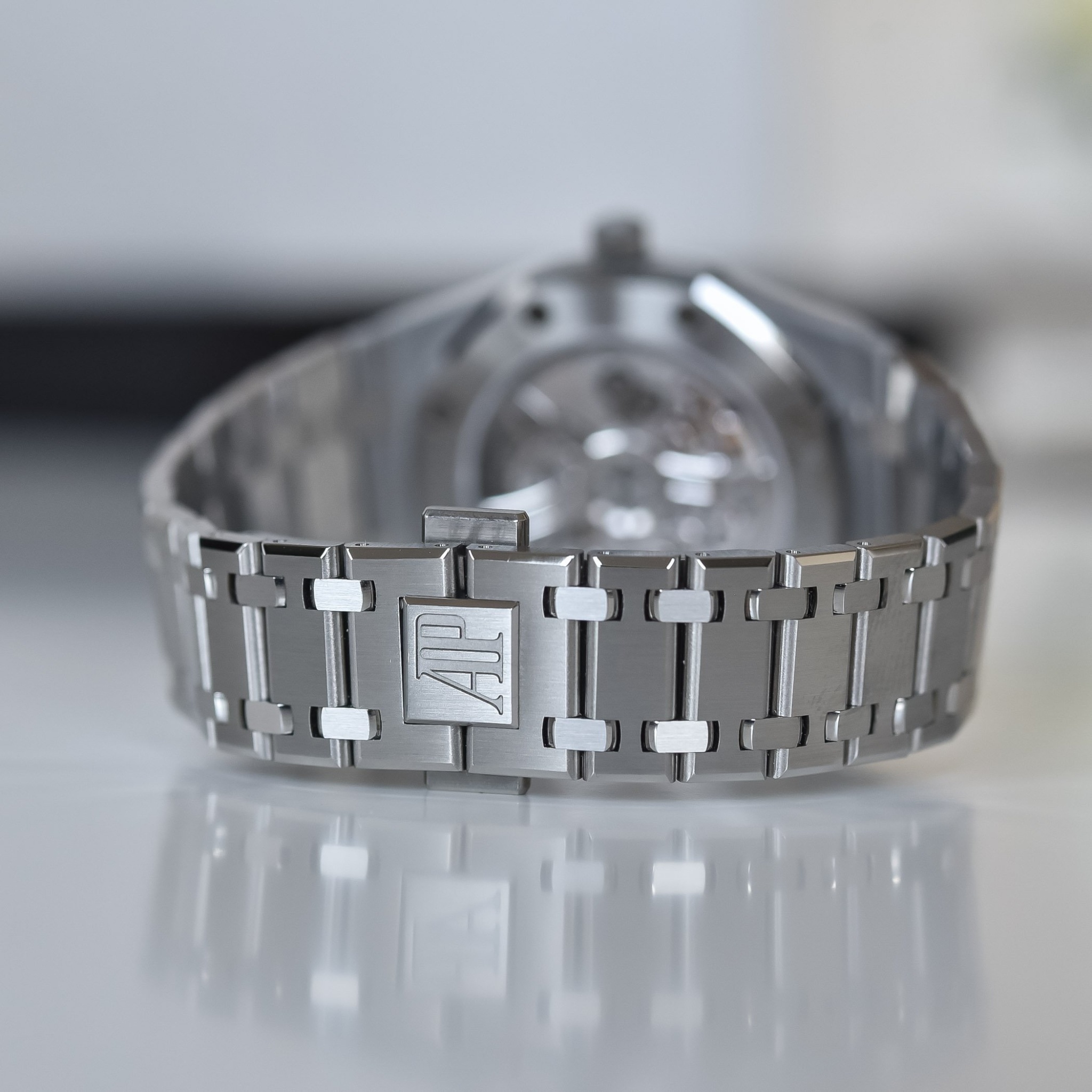 Blue dial, satin-brushed, blue counters, white gold applied hour-markers and Royal Oak hands with luminescent coating.