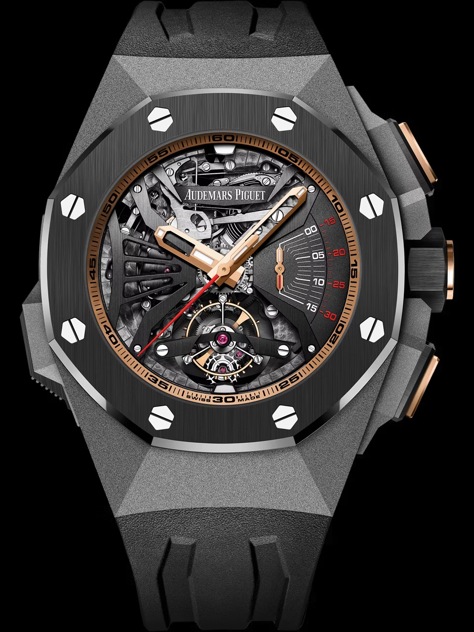 black ceramic bezel and a cutting-edge openworked dial highlighted with