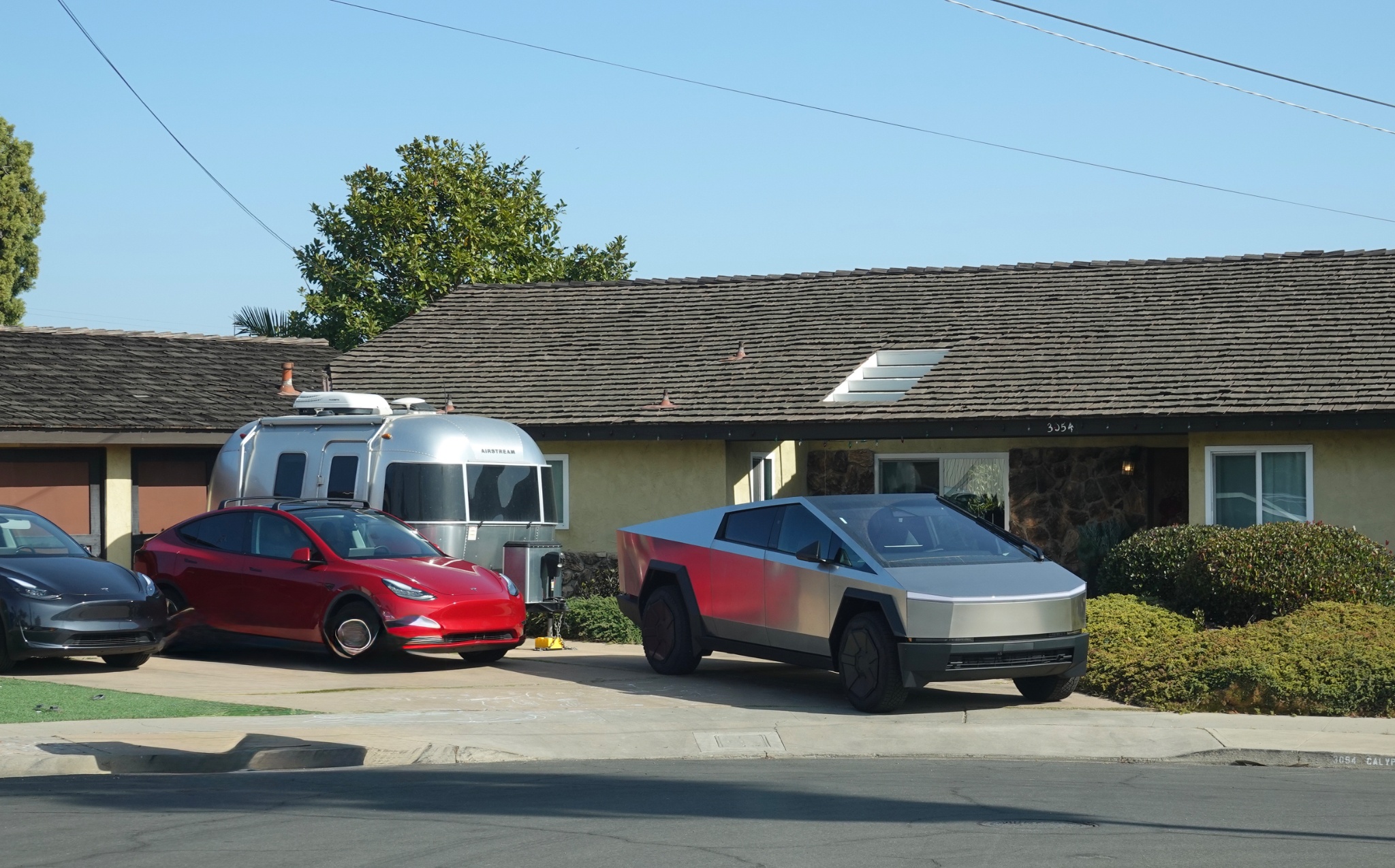 Not too far from the swap meet I passed a pair interesting homes a stone’s throw from each other, starting with a 3-Tesla Ranch with Airstream for traveling (pulled by Cybertruck?)