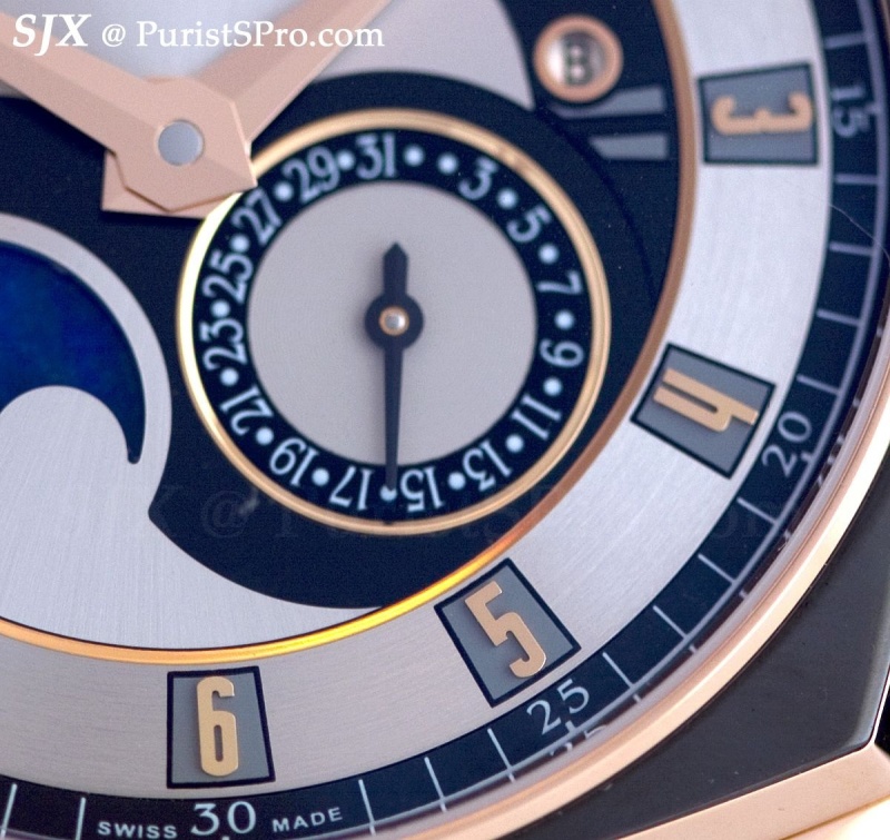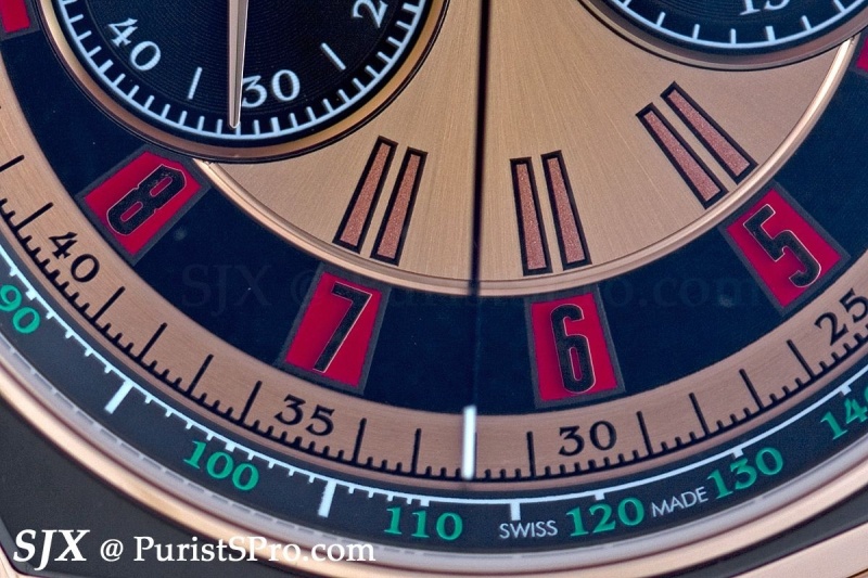 La Monegasque includes a chronograph, automatic, perpetual calendar and tourbillon. The details of the designs are worth noticing, like the black enamel border on the bezel found on some of the models. And I really like the serif font for the minute track and tachymetre.