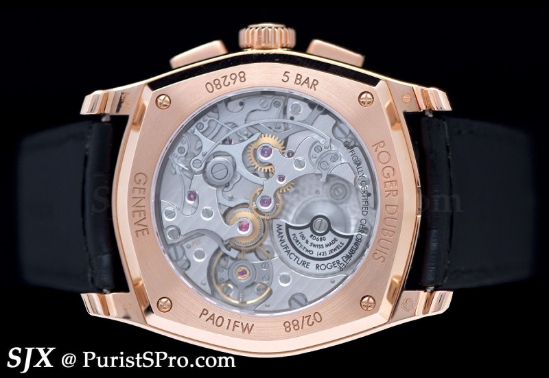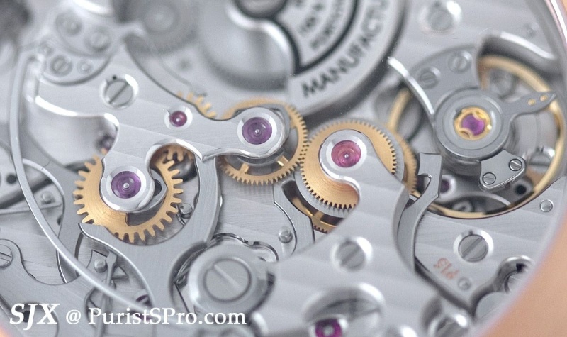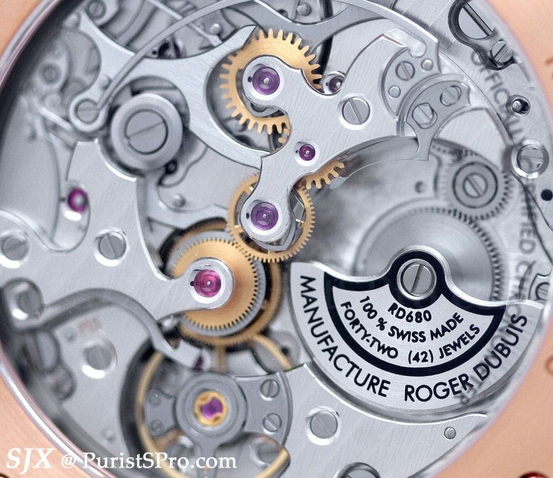 My pick of the new range is the chronograph, which uses the latest RD in-house calibre, the RD680. It is an automatic movement with microrotor featuring a column wheel chronograph. Created as the entry level chronograph movement for the brand, the RD680 is not quite as elaborate (look at the bridge shapes and levers) as the other RD calibres but nevertheless respectably constructed and finished to Geneva Seal standards. I would, however, strike out the clumsy “100% Swiss Made” line from the rotor.