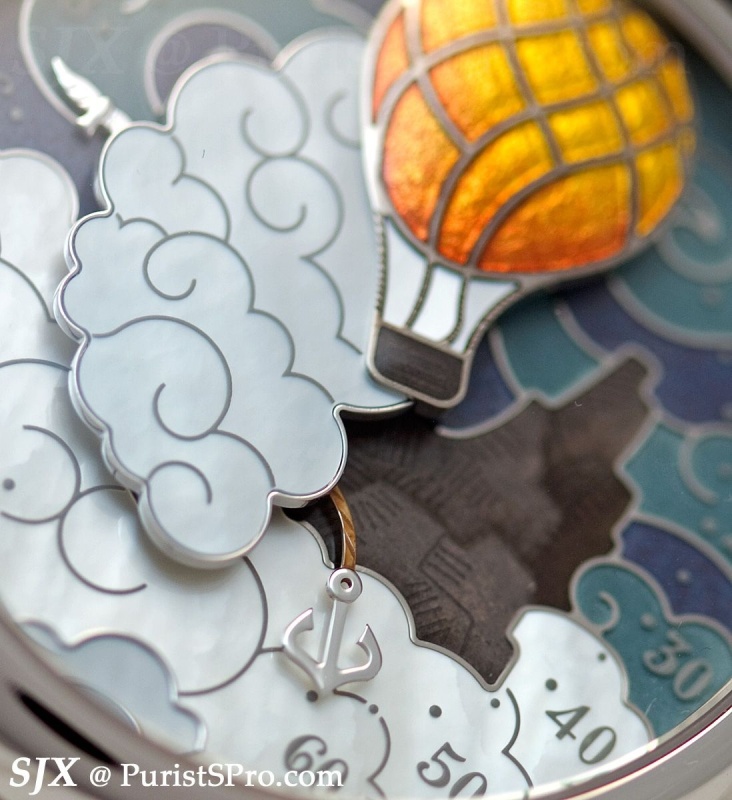 The dial is champlevé enamel with mother-of-pearl forming the clouds.