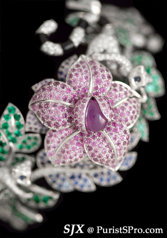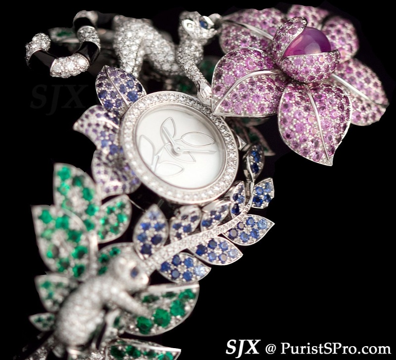 Finally the balloon ends up in the jungle somewhere and for that VC&A has created a unique high jewellery timepiece set with diamonds and blue and pink sapphires. The main flower flips open to reveal the time on a mother-of-pearl dial.