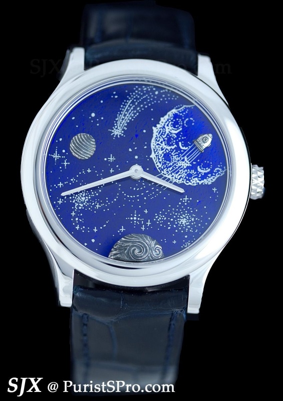 Jules Verne also gives inspiration for the last of the 2011 collection. Les Voyages Extraordinaires, a set of four enamelled watches in an enormous wood box that resembles a chest, depicts motifs from four of his novels: Five Weeks in a Ballon, Twenty Thousand Leagues Under the Sea, A Journey to the Centre of the Earth and From the Earth to the Moon.