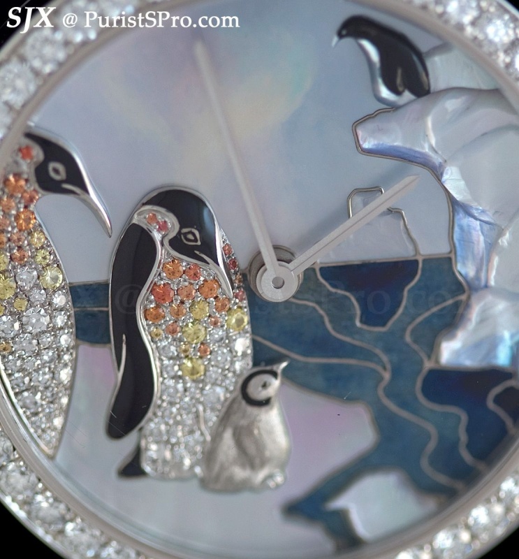 Each of these has a stunning, vividly coloured paillonne enamel dial with gold and silver for the relief portions. And despite the serious artistry in the dials, the designs are bright and amusing.