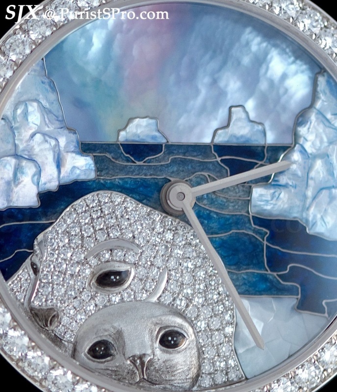 The second series of four watches depicts creatures of the Ant arctic. Here you see the polar bear, seal, penguin and whale. Unlike the vibrant shades of the Africa series watches these timepieces are almost entirely comprised of various tones of blue.