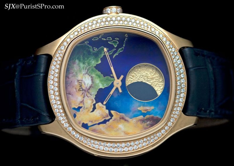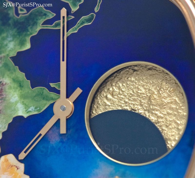 Two new models were added to the Emperador Coussin line, though both are variations of the moon phase model launched last year. The first features a cloisonné enamel dial, depicting Asia and the Middle East in this case, but presumably any region the customer desires. This is a beautifully crafted and attractive watch but the hands are disturbingly unsophisticated.