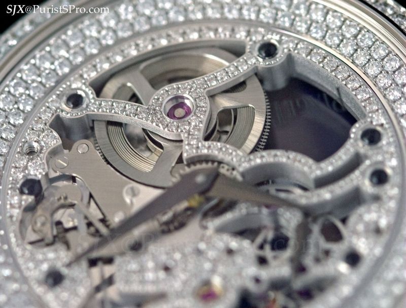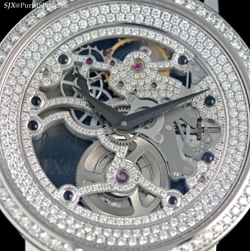 Another addition to the Altiplano collection is the Gem-set Skeleton. This is a 40 mm, though it looks small, white gold watch set with nearly 400 diamonds, albeit small ones, totalling about 2.5 carats. The manual-wind movement alone has 174 diamonds set on the bridges, which are solid gold.