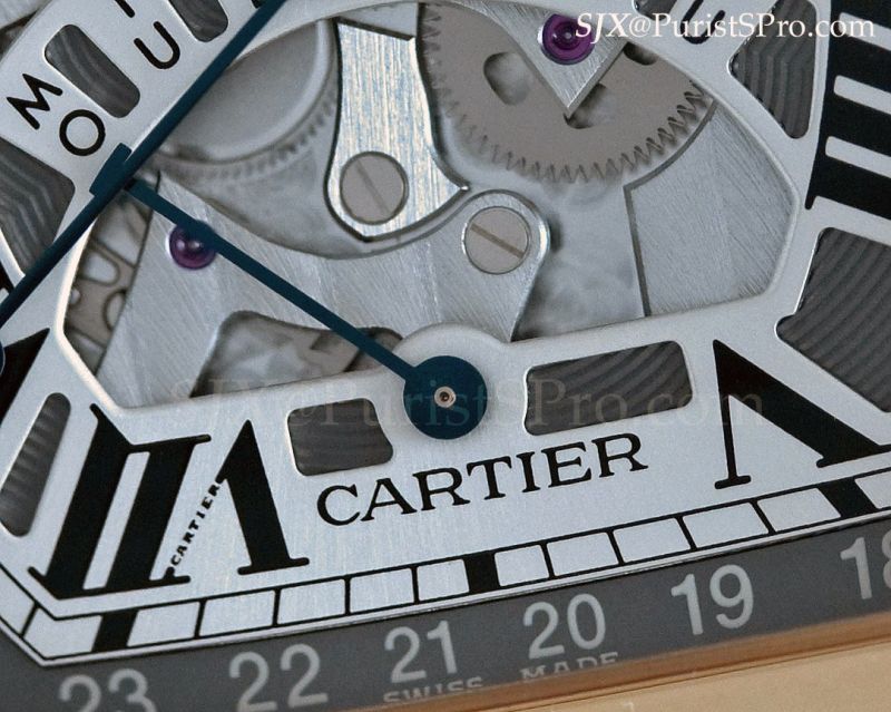 It uses the 9455 MC calibre manufactured in Geneva and is derived from the Roger Dubuis tourbillon calibre though it has been heavily and evidently modified. The movement has the Geneva Seal and is a marginally better finished than the Santos Dumont Skeleton. For instance the keyless works of the tourbillon have a deeper, more evident bevelling than the skeleton. However, the Roman numeral bridges exhibit a similar sharply bevelled edges as the Santos skeleton.
