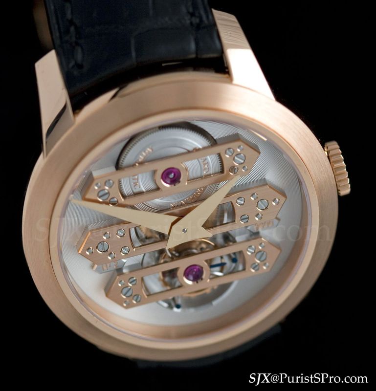 This version is similar to the square cased Vintage 1945 tourbillon offered last year with its straight bridges inspired by a vintage pocket watch. Unusually though this is housed in a rose gold case that is 41 mm wide, making it the largest round, tourbillon-only Three Gold Bridges.