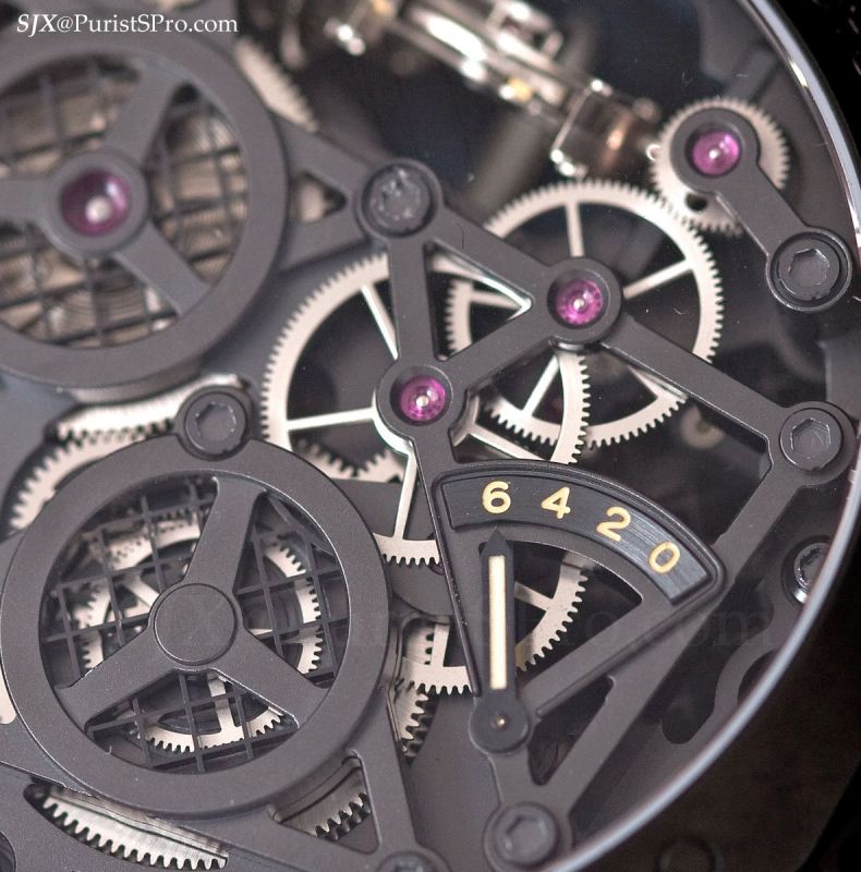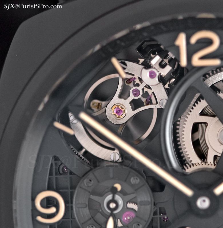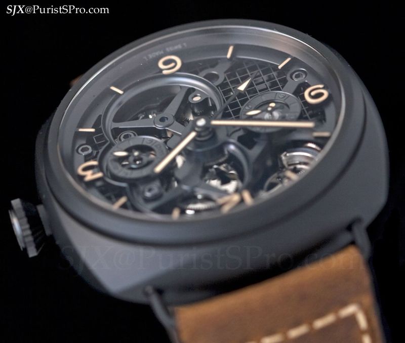 Housed in a 48 mm ceramic case, it contains a skeletonised version of Panerai’s tourbillon movement; the movement is mechanically the same as the ordinary tourbillon. Particularly out of the ordinary is the movement design – the base plate is a mesh-like platform, giving the movement a military-industrial type look.