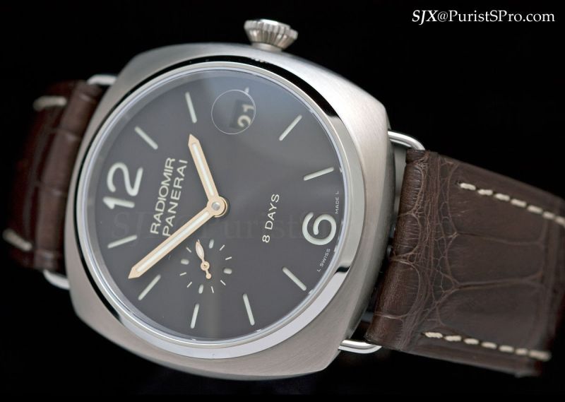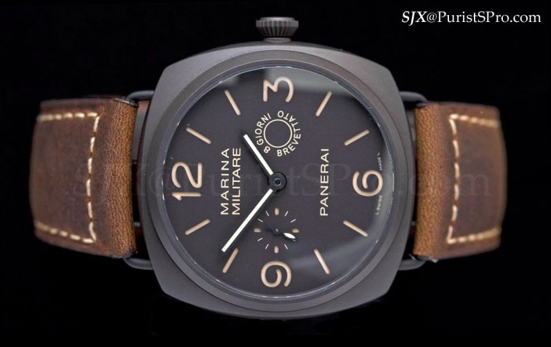 Another new Radiomir is the PAM346, an 8 day watch in a 45 mm titanium case. The movement is the in-house P.2002/9. Gold hands and a titanium case, once again a winning combination, this time with the added bonus of the 8 day movement.