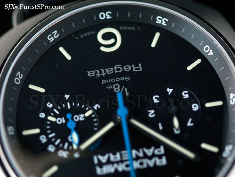 The next chronograph brings us to the Radiomir watches. The PAM343 is a foudroyante chronograph, officially known as the Radiomir Regatta 1/8 Second Titanio. Equipped with a Valjoux derived movement, the Regatta chronograph is made to commemorate the Classic Yachts Challenge 2010. It’s 47 mm in diameter and titanium.