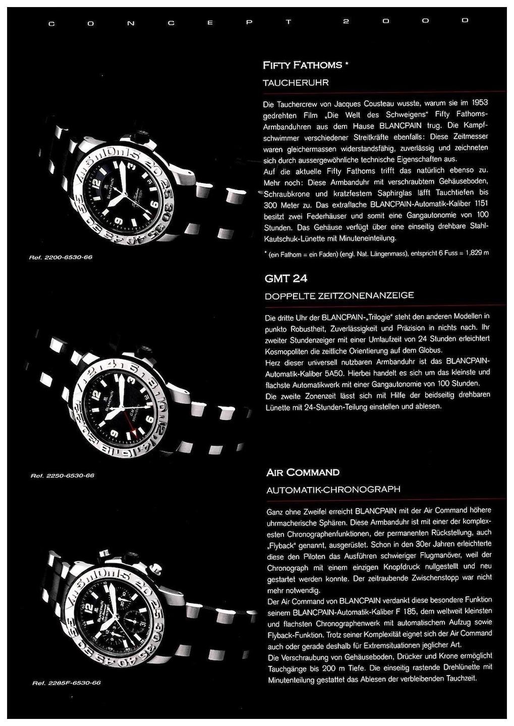 Blancpain SA | "Armbanduhren - Wristwatches - Montres Bracelets" by Christian Pfeiffer-Belli and Gisbert L. Brunner, 2006, Könemann Verlag Köln, ISBN 978-3833125591 | Blancpain "A Tradition of Innovation" | Blancpain "Edition Fifty Fathoms" | Chronos Special Blancpain | Blancpain Brochure "Concept 2000" | Blancpain Catalog 2000 | Blancpain "Lettres du Brassus" Issue 18 | "Militäruhren" Konrad Knirim