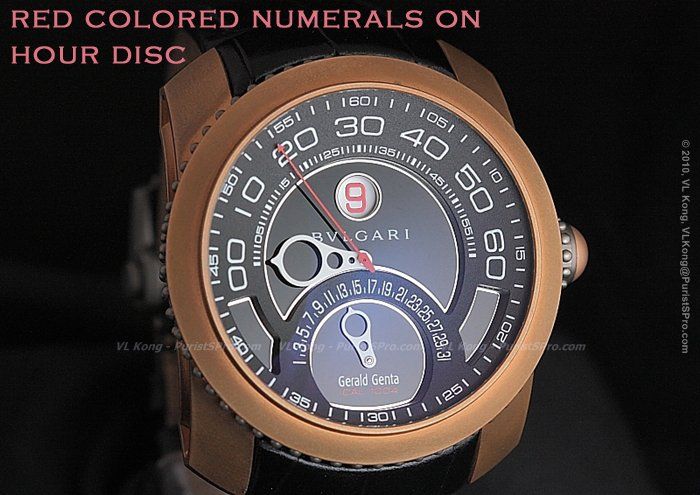 One thing which I think plays a decent role in the change of the look is the color of the numerals on the hour disc. The numbers on the hour disc on the Gerald Genta Gefica are red colored while black colored on the Bulgari variant.