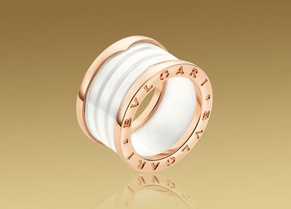 The B.Zero1 Collection of jewelry and watches is a Bulgari signature look. The banded cylinder design element is clean and contemporary with simple lines and a distinctive shape. There isn’t much available in terms of Bulgari jewelry that is under $1000. This ring is a good value priced at $980. I like it because it has a different look than most wide band rings with the use of white ceramic for the center portion of the ring. Ceramic is an extremely popular material these days showing up in watches, jewelry and even shave sets. The pink gold edge is inscribed with the signature BVLGARI BVLGARI logo.