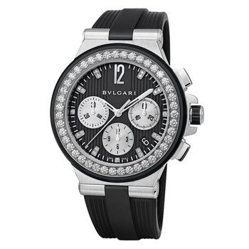 DIAGONO Chrono Automatic watch with a stainless steel and rubber case set with diamonds. It features a black dial set with diamond indexes and a rubber bracelet with stainless steel ardillon buckle. Price: $16,200