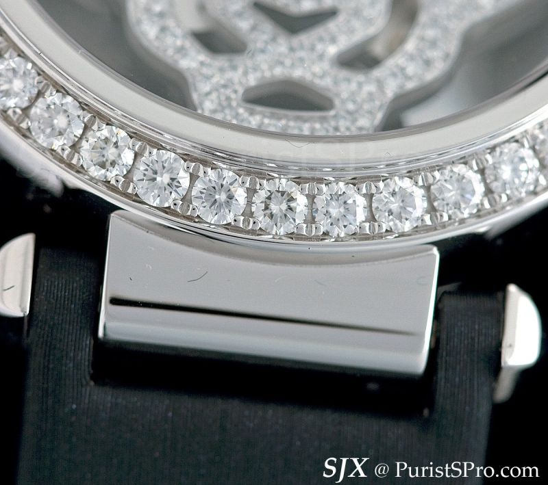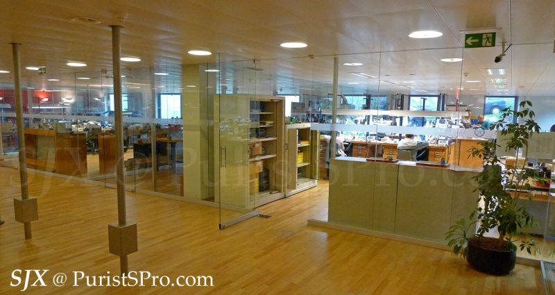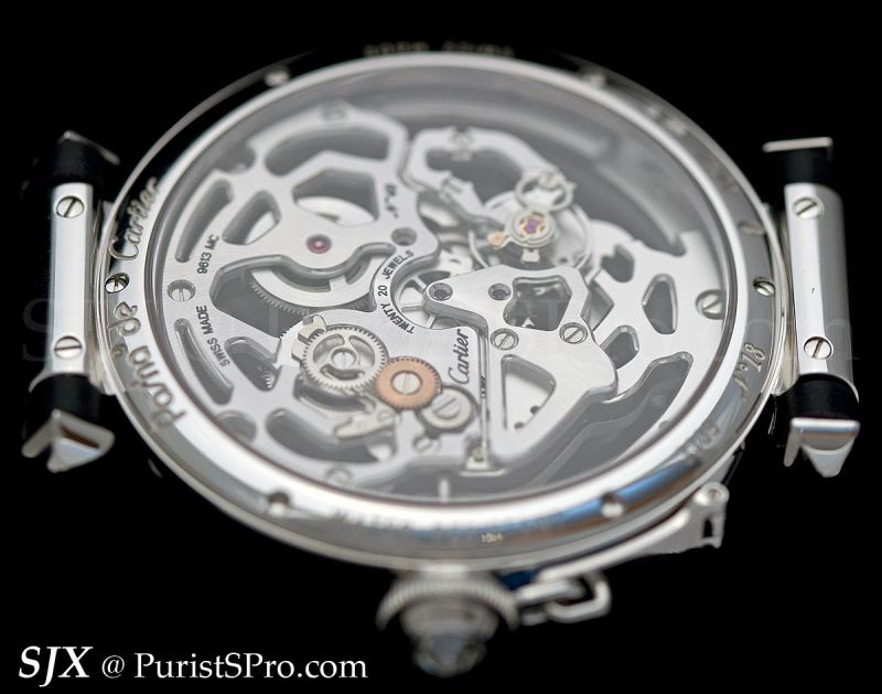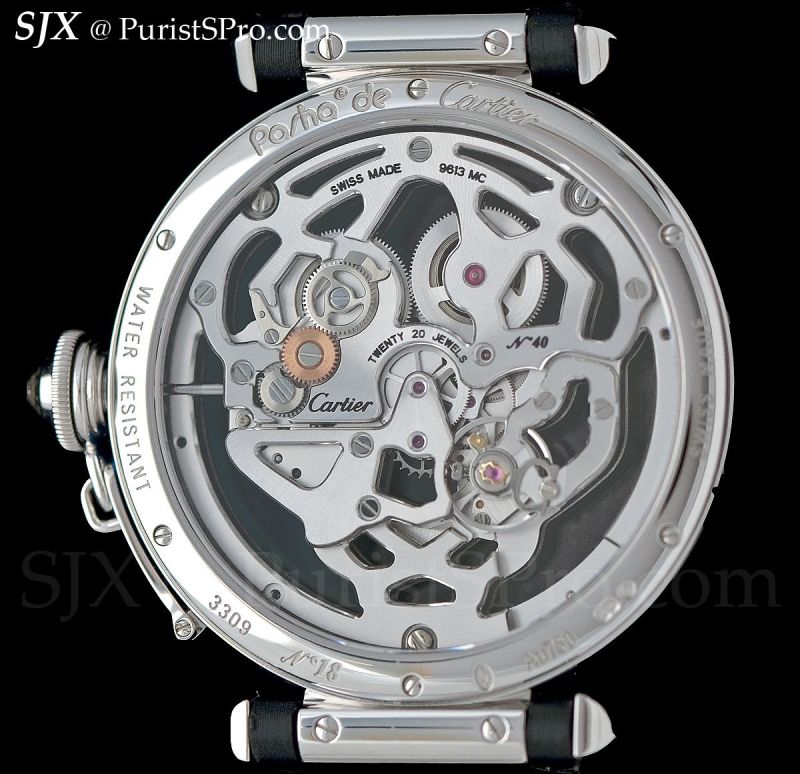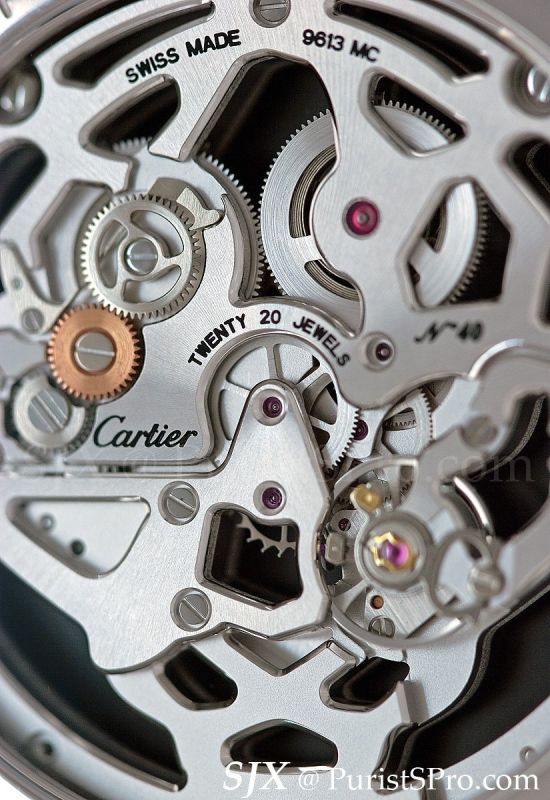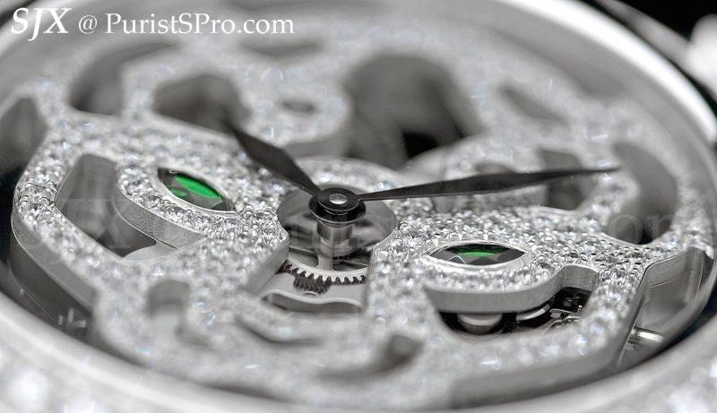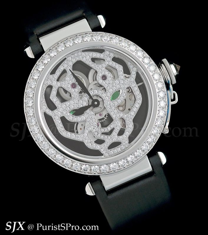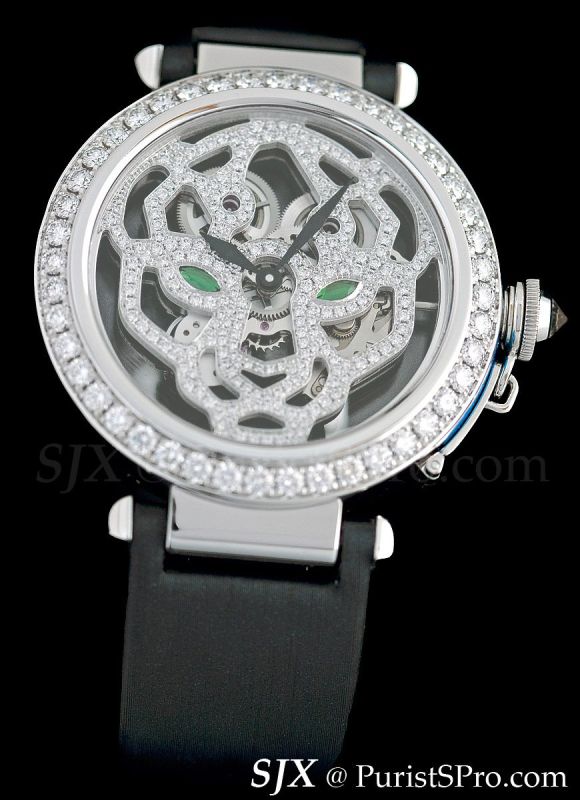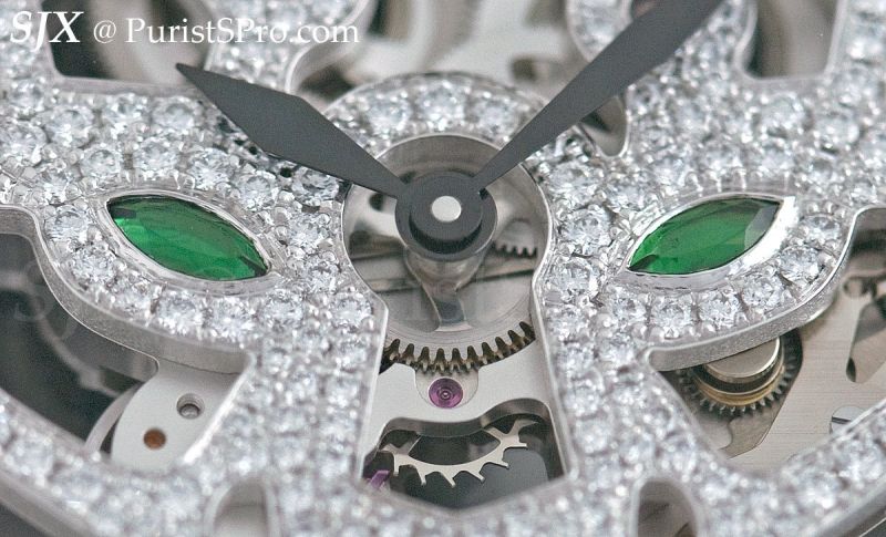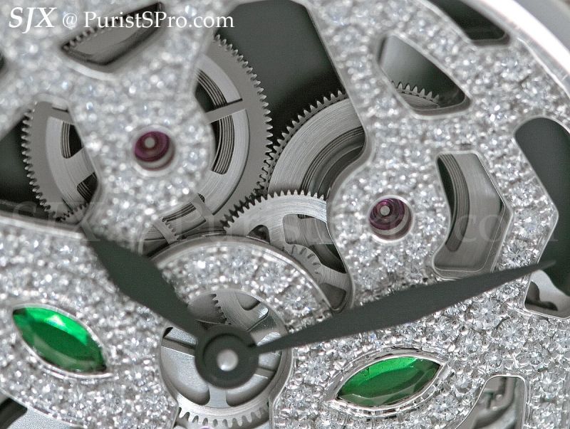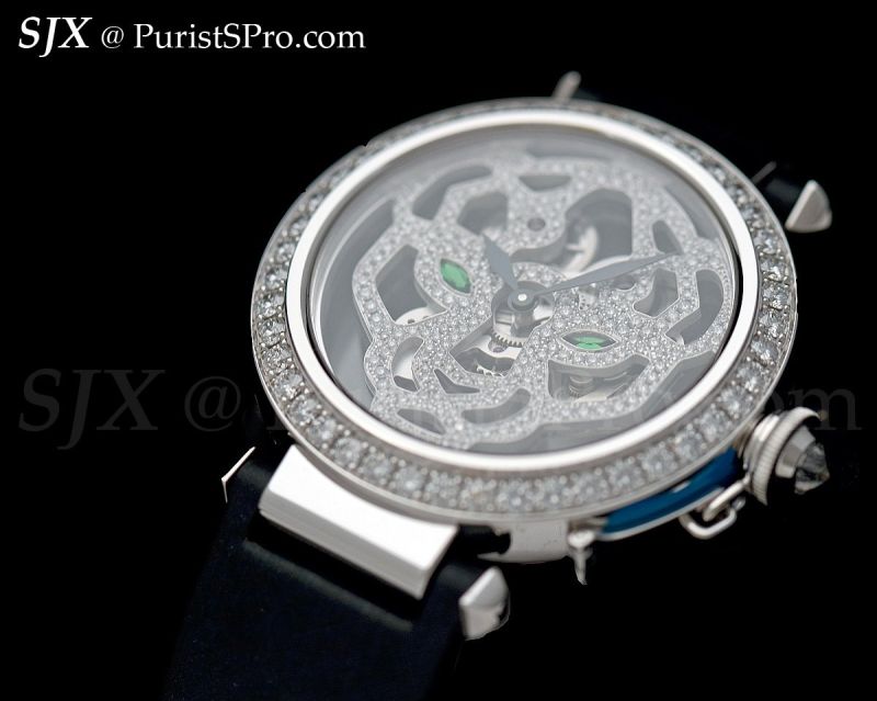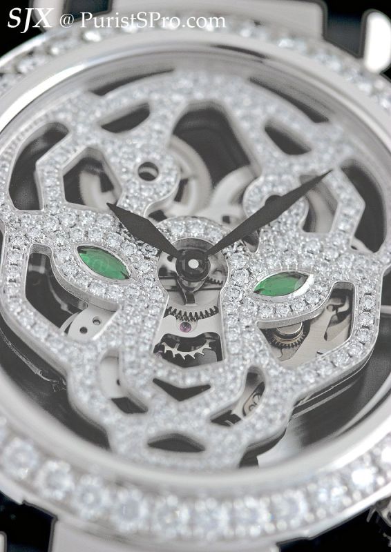 Only a handful of the stunning Pasha de Cartier Panthere Skeleton are made each year. It is a woman's jewellery watch, but one that is also a deeply accomplished technical watch. A woman who wears such a watch probably knows her watches, or at least her husband does! This watch is also a perfect representation of Cartier's skills as a jeweller and watchmaker - the movement is finished by the high horology decoration atelier while the gems are set at the adjacent high jewellery workshop, in the Cartier manufacture in La Chaux-de-fonds (below). Set with 4.1 carats of diamonds on the case and movement, with emeralds for the panther eyes, this is a fusion of high jewellery and highly accomplished watchmaking. The 9613 MC movement used here is a variant of the 9611 MC movement used in the Santos skeleton. The familial resemblance is obvious. As with all watches from the Fine Watchmaking, the movement is finished to haute horlogerie standard, with beautifully executed anglage; though I do wish there were some sharp interior angles on the bridges which would take the movement finish to a whole new level. Watches like this skeleton, as well as the jump hour are to me the highlights of the Fine Watchmaking collection, because they represent high watchmaking with a twist, in a way that few others can accomplish. On the other hand, models like the flying tourbillon - which is a well crafted and also well priced timepiece - are less interesting because they are not to different from the competition. I hope to see, and I know I will, more watches like this at SIHH 2011.