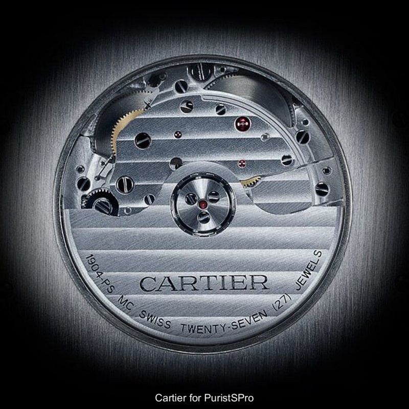 A self-winding watch with the first movement produced by the Cartier Manufacture, the 1904 MC, with its oscillating weight and beautiful mechanism visible through the sapphire case back.