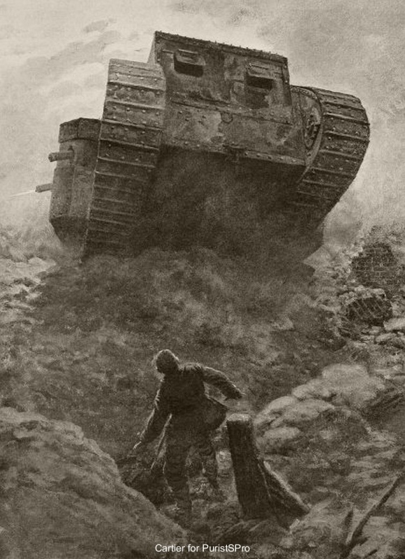 There is also the apocryphal story about the cover of the magazine L'Illustration 2nd December 1916 edition that triggered the design cues in Louis Cartier's mind. Looking at the military tank blueprints, one must admit to some similarity but Cartier's rendition is highly stylised. The fact that Cartier call the long sides 'brancards' rather than 'tracks' convinces me that the armoured vehicles were not the sole source of his inspiration.