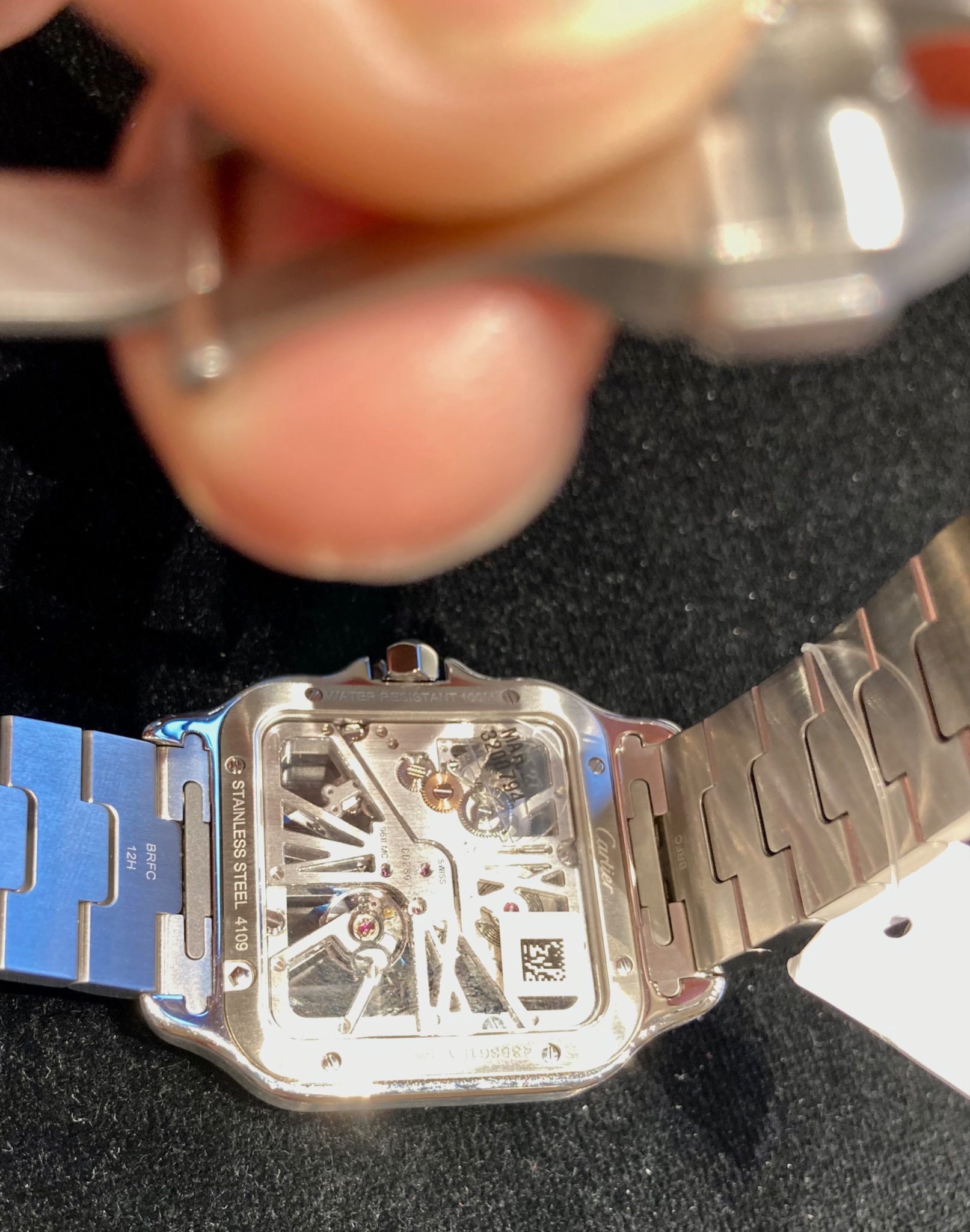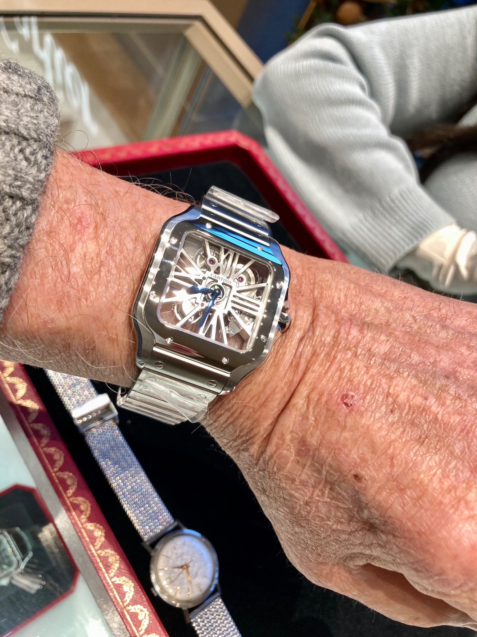 Being a square watch they do tend to wear a bit larger than their stated size indicates. Also the medium is no date that I feel is a positive attribute on this particular watch. If you haven't already done so I'd encourage you to read through "Geo" s posts on this site. He was pretty much THE authority on Cartier and his writing is still relevant. Here's a pic of my last encounter with a Santos. Personally I think its a bit much and given the chance I'd rather have a medium. Good luck on your quest. Can't wait to see it if it happens!