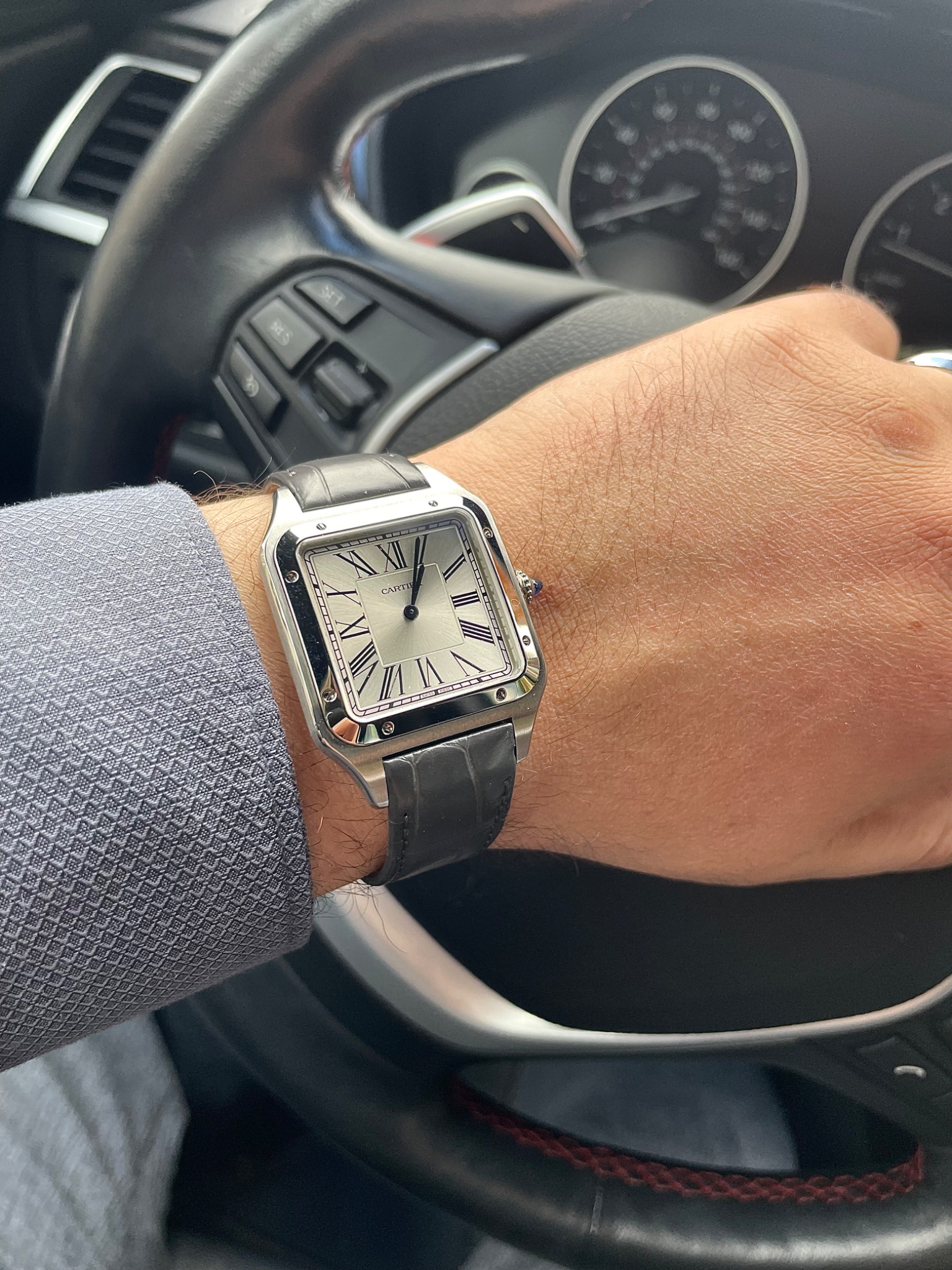 Explore the Cartier Santos Dumont in platinum with a burgundy lacquer dial. als1678 shares insights on its design, craftsmanship, and market availability.