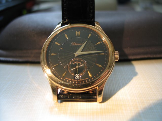Kong, I had the original dial replaced to the current dial you see pictured. At that time Chopard updated the front crystal to A/R and updated the disc wheel to rose colour as well. It was part of a service overhaul to bring the watch up to current standa...