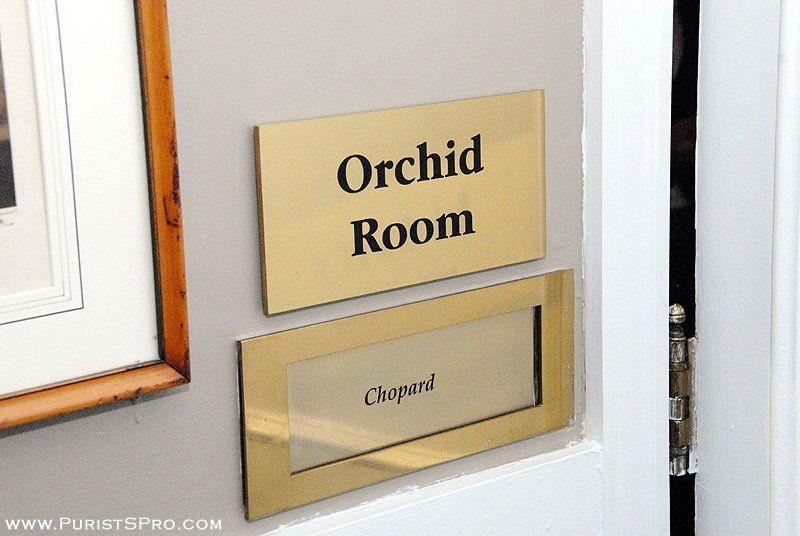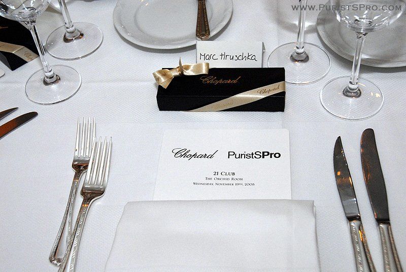 The November 19, 2008 Chopard PuristSPro dinner event was held at the landmark 21 Club restaurant on 21 West 52nd Street in NYC. 21 Club is a 4-story townhouse with 10 private dining rooms, and 30 jockey statues line the staircase and balcony.