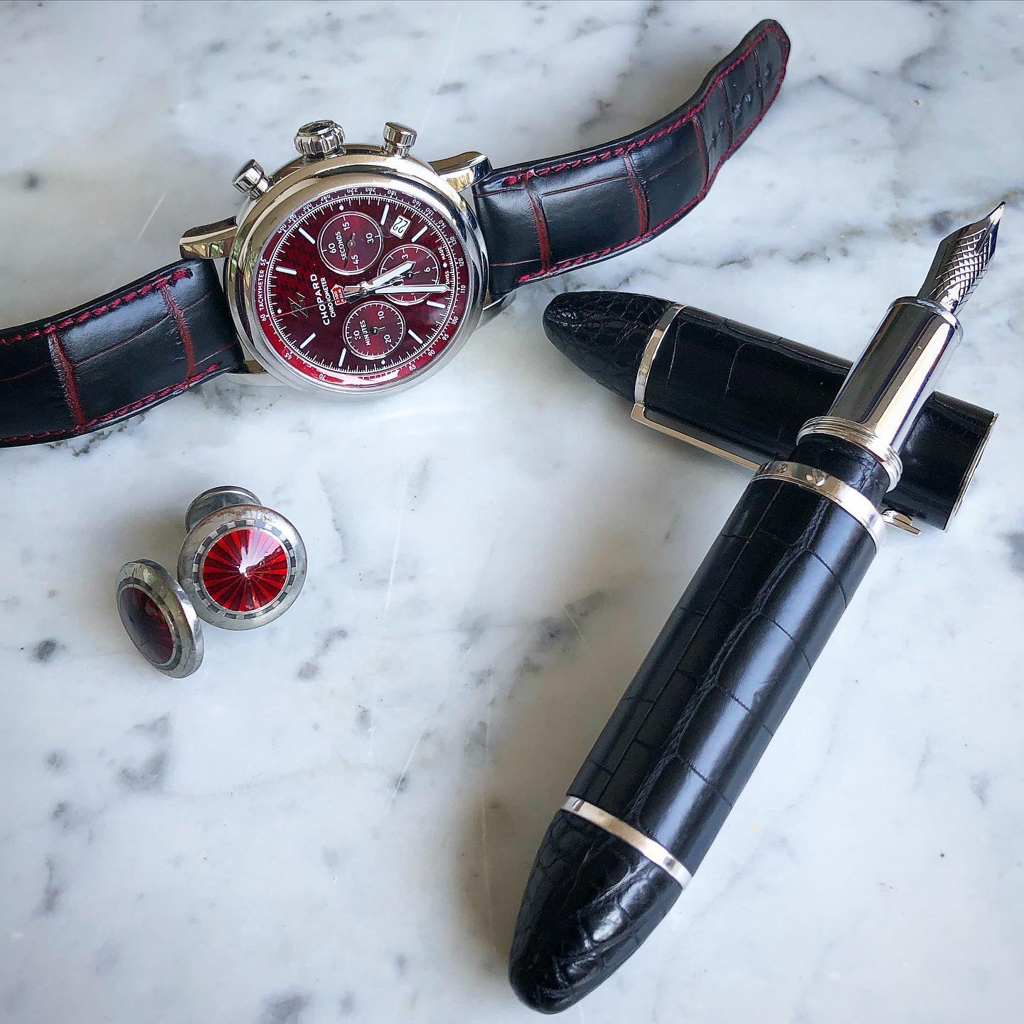 With a Louis Vuitton Cargo Fountain Pen black alligator & Burgundy enamel cufflinks