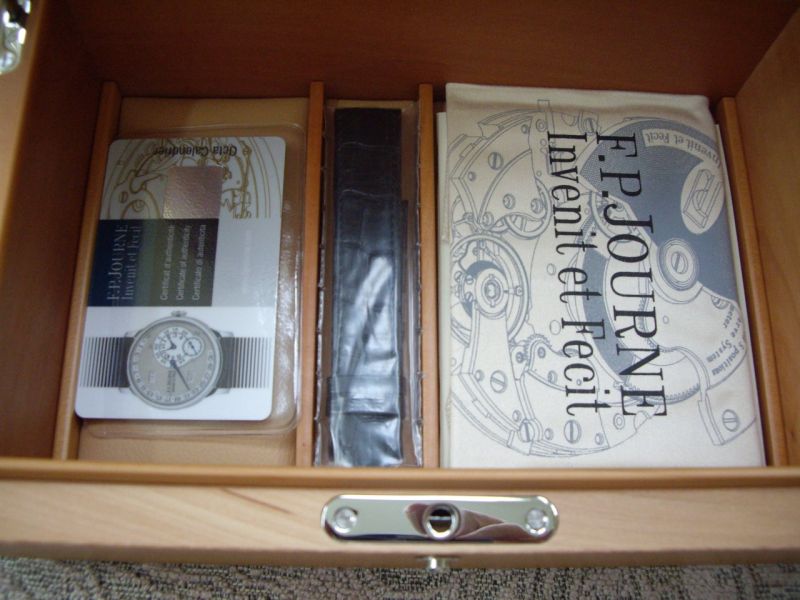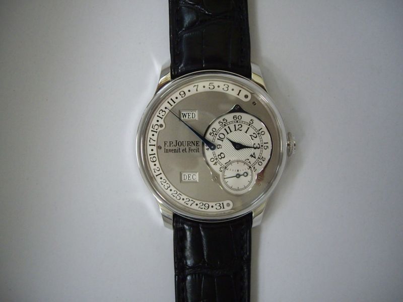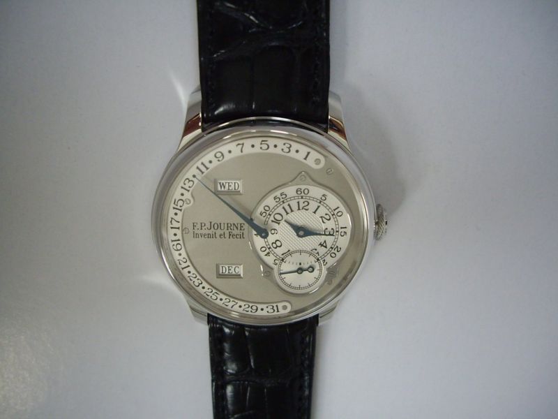 Brand new like F.P. Journe Calendrier platinum 38mm (only worn twice) with rose gold movement. Annual Calender with retrograde movement, 120 hour power reserve. Watch was purchased in 2007. Complete with all boxes and papers (extra brand new strap). Asking for $33,000 USD.