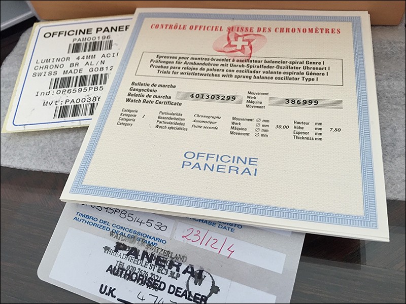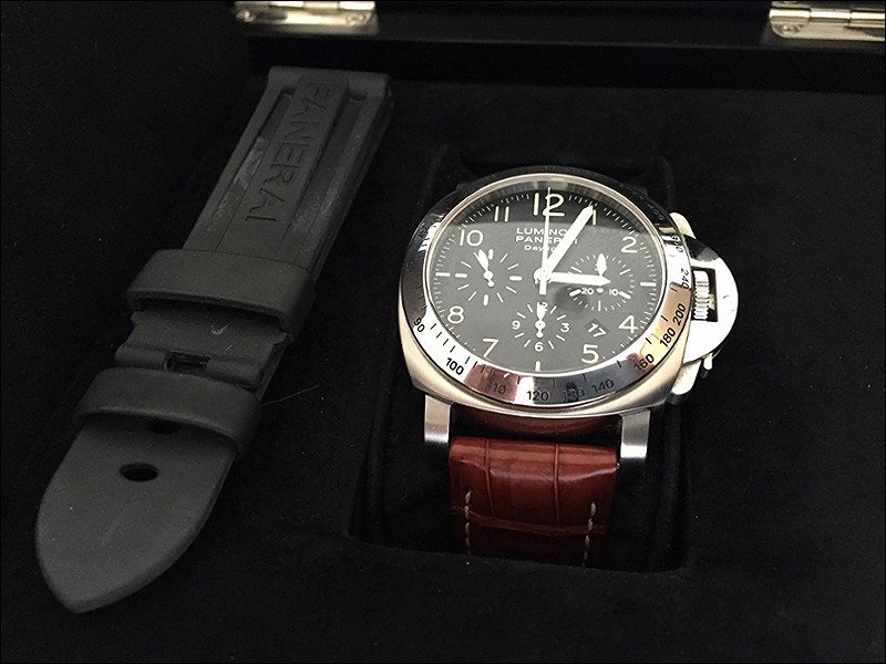 Panerai PAM 196, “Daylight” Chronograph, in 95% condition. I'm the original owner, purchased at authorized retailer in London, UK. This retired model features a polished bezel with tachy scale and Arabic number dial. Black rubber and brown croc strap. Outer cardboard box, black box, wooden box, all booklets, card, COSC, both stickers, i.e. all papers and boxes. Priced to sell: $5,500 worldwide, shipping with FedEx worldwide, shipping cost approx $250. I'm located in Dubai, United Arab Emirates. Payment by wire only and ships when funds are cleared. Worldwide references upon request and would like to check buyers' references as well.