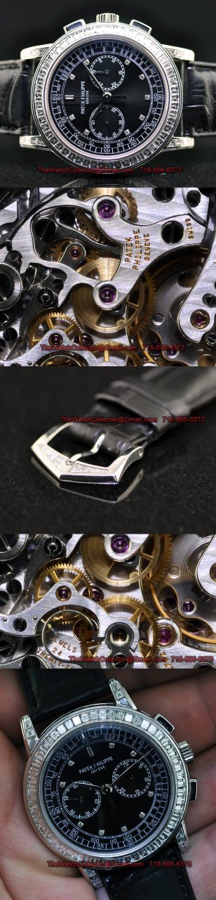 This special order exclusive timepiece was produced in very low numbers and is now out of production. Specially made to order for well known Patek Philippe collectors, only a select few were able to purchase it. This watch features a 42mm case, Lemania manual wind chronograph movement and flawless, factory set baguette diamonds on the case, bezel, in between the side pushers, lugs and buckle. The buckle is set in platinum. We have the watch on hand and ready for delivery via Brinks Security or private courier. The set is complete with boxes and papers which are also on hand at our office. Private showings at our office are available by appointment. Serious inquiries only, please! Please call to inquire. Call Gil at 718-698-6373 or email TheWatchCollector (at) Gmail.com
