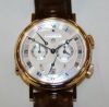 Description:: Facinating Alarm watch. Features: Hours & Minutes (large hands), Small Seconds Hand & Date at 6 o'clock position, Alarm on/off window displayed beneath the 12 o'clock & is controlled by the button at the 8 o'clock position, Alarm Power Reserve indicator displayed between the 10 & 12 o'clock, Alarm Time indicated by the sub-dial at the 3 o'clock & finally a 24 hours/2nd time zone sub-dial at the 9 o'clock position. Beautiful Hand Engraved (engine-turned) Silver Dial. Roman Numeral Hour Markers. Blued "Breguet" Style Hands. 45 Hour Power Reserve.