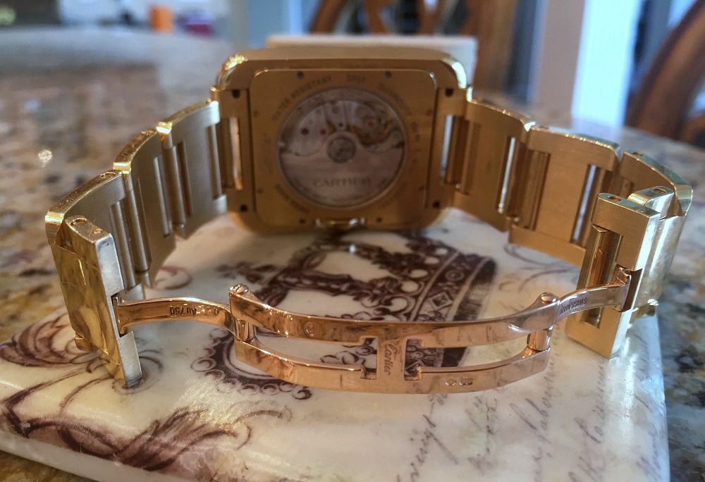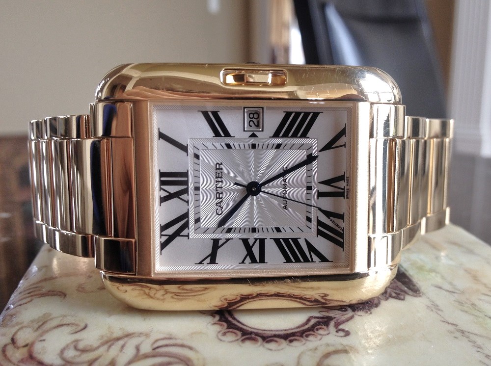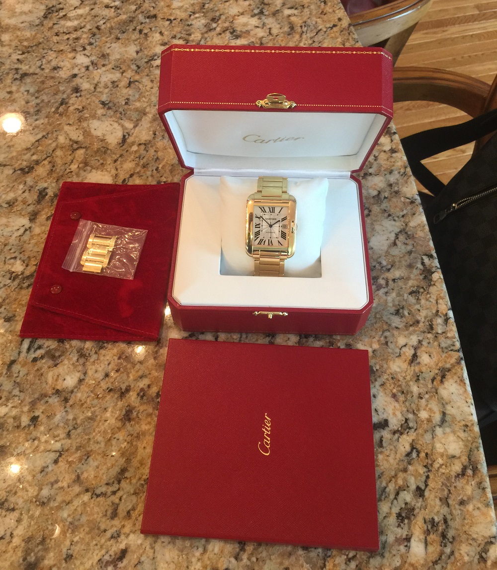 Hi – Presented for your consideration is my beautiful 18K Yellow Gold XL Large Tank Anglaise style# W5310018 from Cartier. Cartier makes the Tank Anglaise in three sizes, this is the largest. The watch is in Excellent Condition. It has been worn in daily rotation with 5-6 other watches for about a year, and so has probably spent somewhere between 50-75 days on the wrist. It has light surface scratches on the case and bracelet that are consistent with this wear, the watch is otherwise perfect and is keeping great time. The new owner may wish to have the watch polished by Cartier to bring it back to 100% like new, frankly I don’t think it needs it. It is 100% authentic and is still under Cartier Manufacturer’s Warranty. Features include: • 18K Yellow Gold case Large size 47mm x 36.2mm. • Self-winding caliber Cartier 1904MC movement. • Nine-sided crown set with a sapphire. • Original Silvered and lacquered flinqué dial with Roman numerals and sword-shaped blued-steel hands. • 18K solid Yellow Gold bracelet. The watch was purchased from an Authorized Cartier Dealer and is sold with everything it originally came with - the original Cartier storage box, papers, and booklets. It is a heavy watch and weighs a little under 220 grams (that is a lot of gold!). All links included, will fit a wrist size up to 7.5 inches. Currently two links are removed (included). Please note the watch is indeed Yellow Gold, although it appears a little warmer in some of the photos. Also, to access size, I enclose a picture next to my 45.5mm Rose Gold Omega Planet Ocean chronograph. Hopefully, this gives you a good sense of scale of the Cartier. Omega not included in this sale. The current Cartier Retail Price is $44,800 plus Tax. The cheapest pre-owned piece I can find is $28,888 and it does not come with a Cartier Warranty. I’m going to price this one below market at $22,990 (with free expedited shipping) in hopes of a quick sale. Sorry – no PayPal, bank-to-bank wire transfer only. I am happy to do a face-to-face transaction in Northern Virginia / Washington DC or New York. Questions please e-mail me norolin AT hotmail DOT com (remove spaces, use appropriate signs). Many thanks! NickO