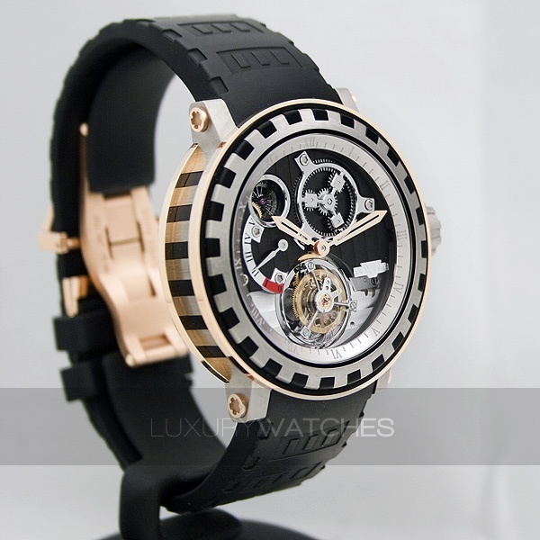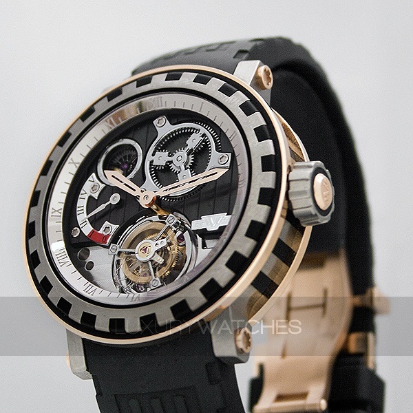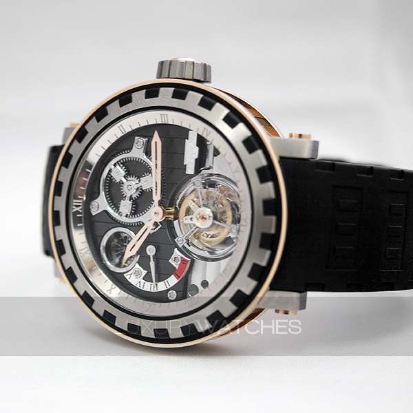 This model is fitted with a DW 8002 mechanical, manual winding movement, manufactured in Vandoeuvres by the master watchmakers of the DeWitt Manufacture. In addition to the tourbillon complication, this exceptional movement incorporates an innovative power reserve winding system, the IRM 2005 patent. This innovative movement developed and manufactured by DeWitt features a 120-hour power reserve. Its component parts are laid out with a totally new aesthetic and can be admired through the transparent case back protected by a sapphire crystal. It is housed in the famous Academia case, with hezel and middle section engraved with the DeWitt Imperial Columns, in an all-new version combining titanium with red gold and intense black rubber. The dial is replaced by a succession of revelations of engine-turned, black and grey plate and bridge with Cotes de Geneve decoration. This model is available on a black rubber strap with the Imperial Column motif stamped in the material, with a titanium folding clasp. Limited series of 250 pieces.