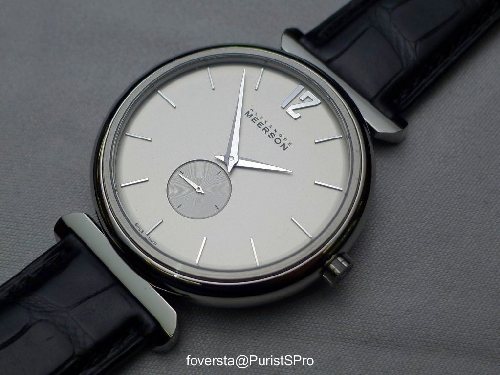 The dial has a traditional combination of baton hour markers and dauphine hands. Traditional? Not so much because finally some surprises lurk here and there. The 12 on the top of the dial first. Its sharp shape evokes those of the lugs but more especifically the 2 appears as a stylized Z. This is obviously not a coincidence, since it is the first letter of the middle name of Alexander Meerson. The applied indexes, beveled, long and fine play a dual role. They contribute significantly to the perceived quality of the watch and they mitigate the perceived size of the case as they are closer to the second hand sector.