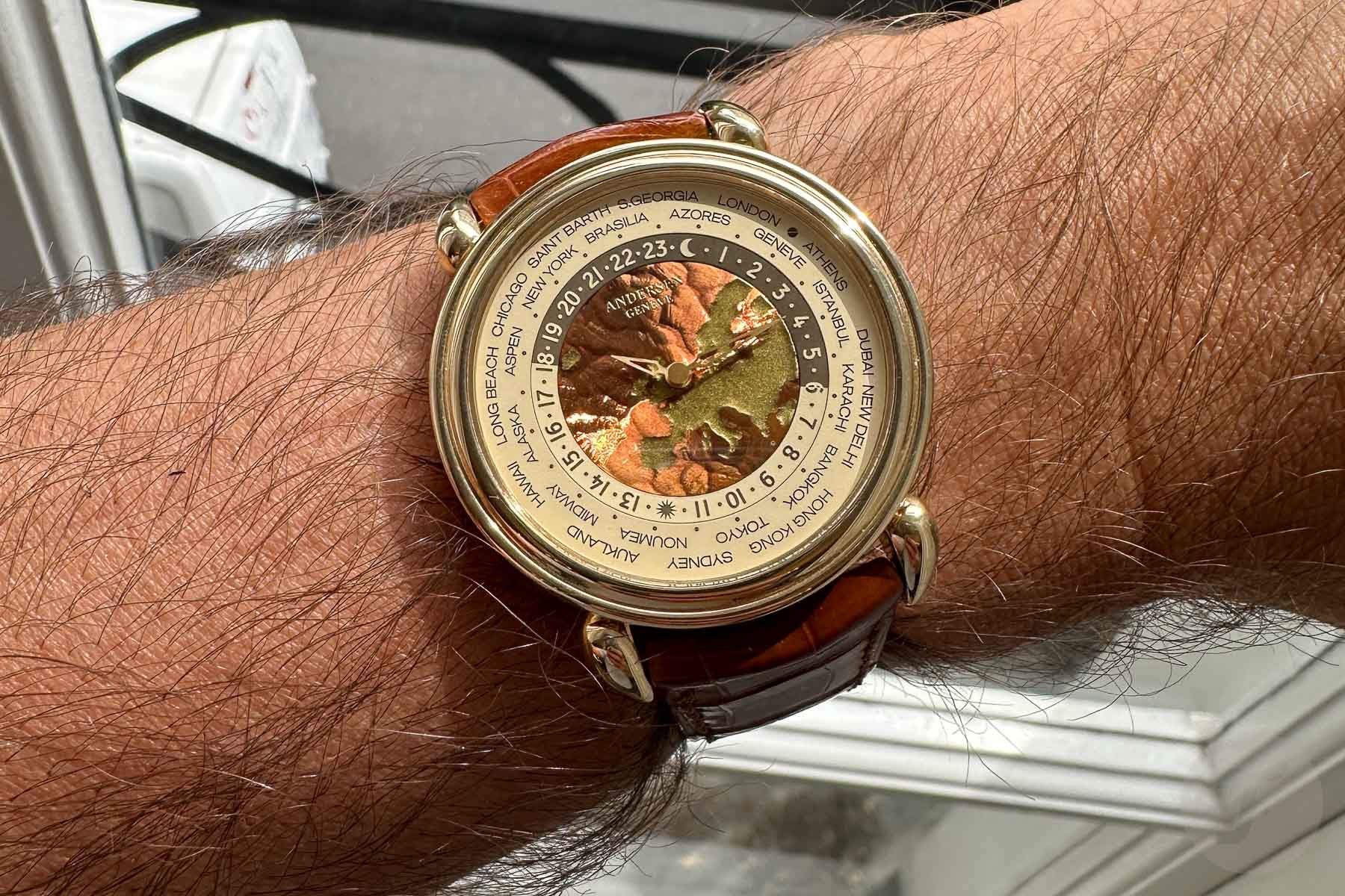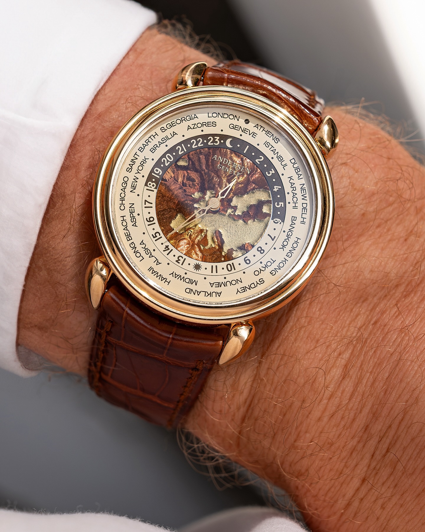 Inside the case is a reworked vintage A. Schild S.A. automatic movement paired with the ultra-thin in-house worldtime module, originally developed by Svend Andersen for the 1990 Communication 24.