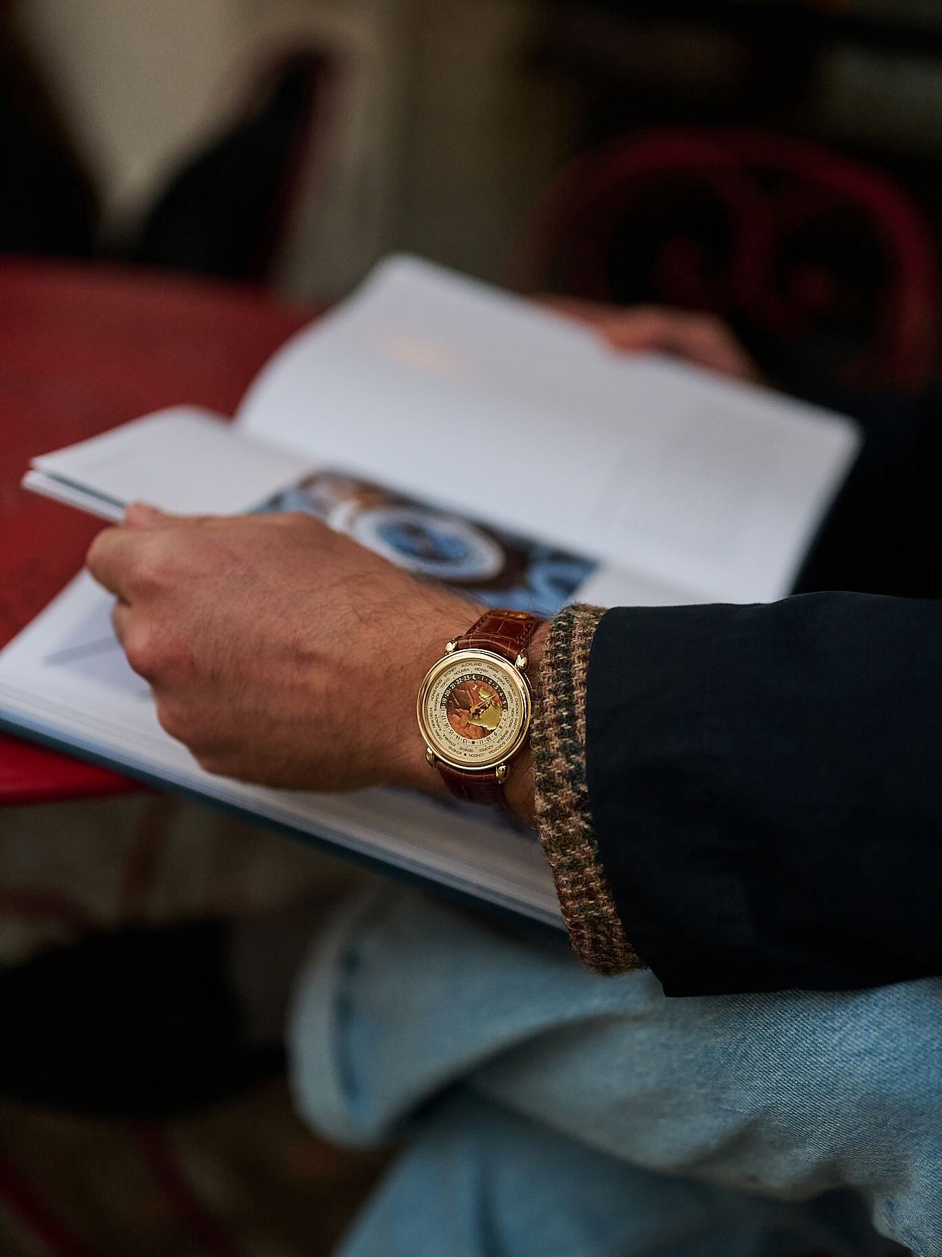 The 3N yellow gold case is made by 83 years old and long-time collaborator Marco Poluzzi in his workshop in La Chaux-de-Fonds (owned by AG since 2022) without the use of CNC machinery.