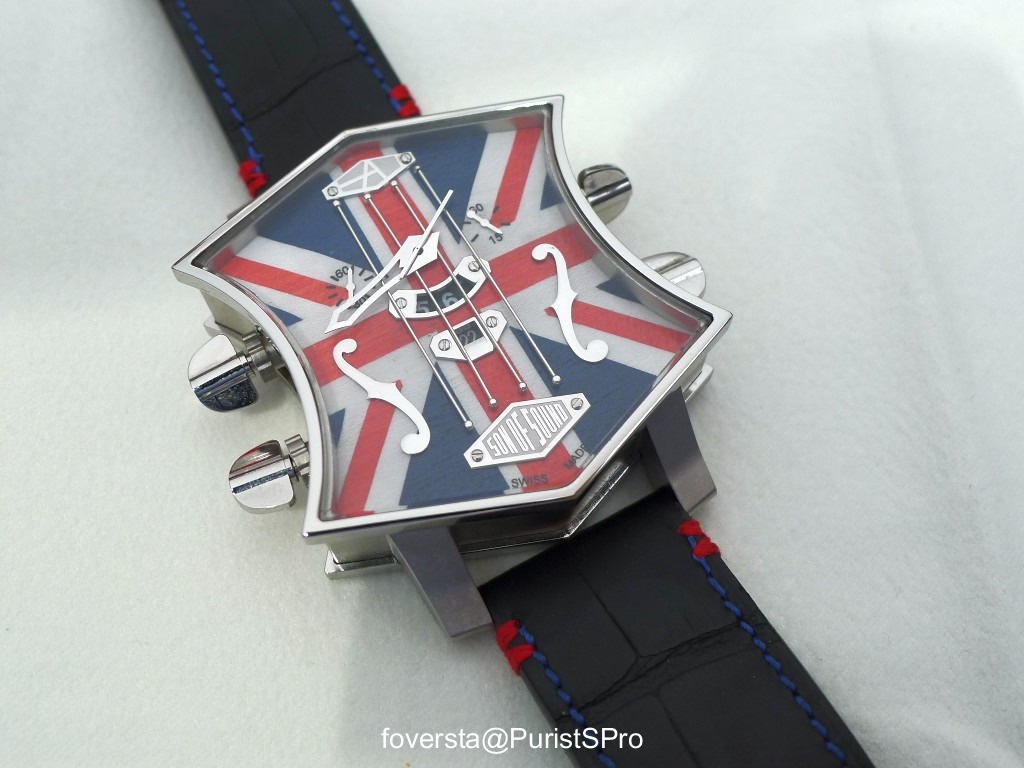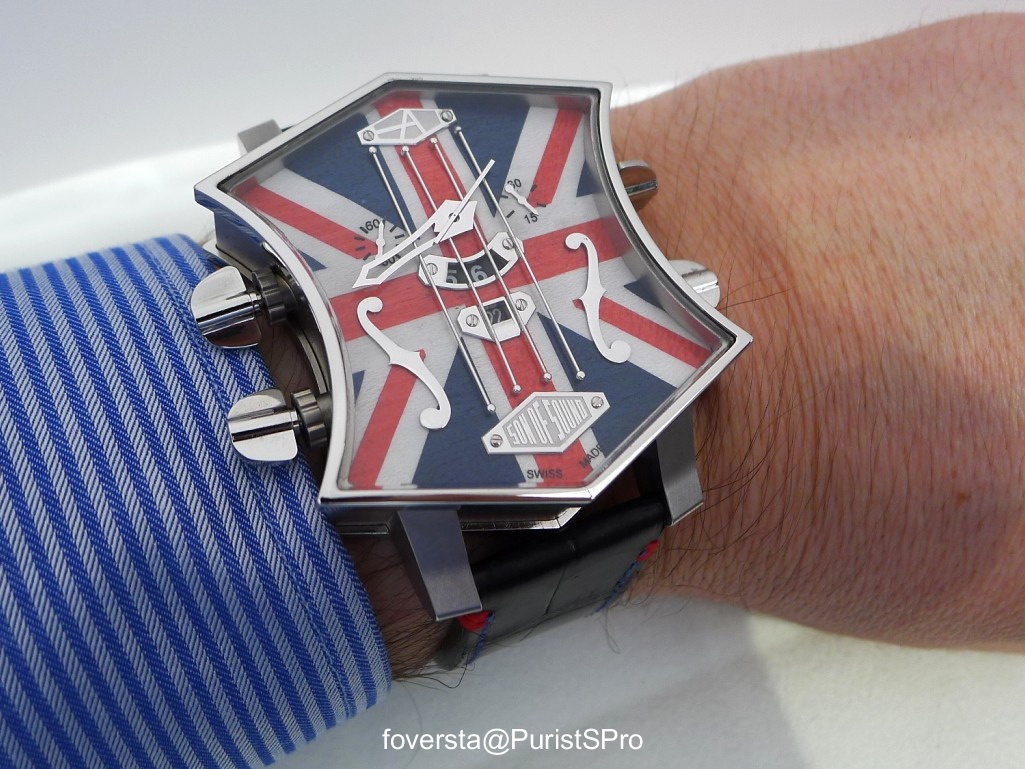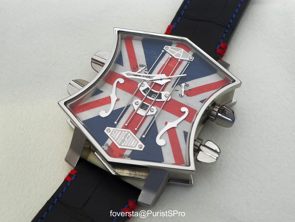 The most representative piece of the collection is the UK edition watch chronograph characterized by its dial decorated with wood marquetry. But each version has a guitar-head shaped case. To manage to even better stick to the desired spirit and atmosphere, the pushers evoke the machine heads and four strings are also represented, crossing down the full middle of the dial. The result is spectacular, disturbing and ultimately attractive as long as you are fan of original watches with character.