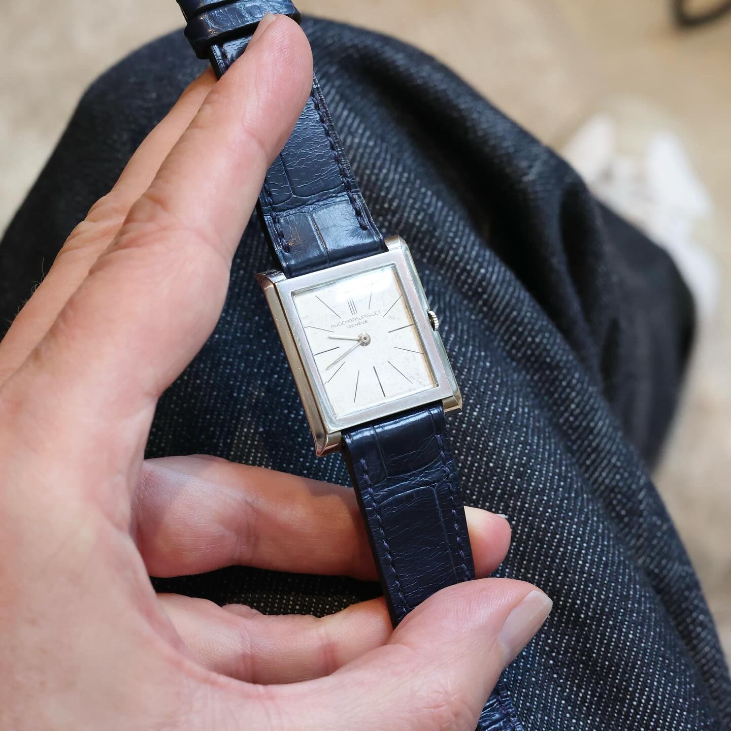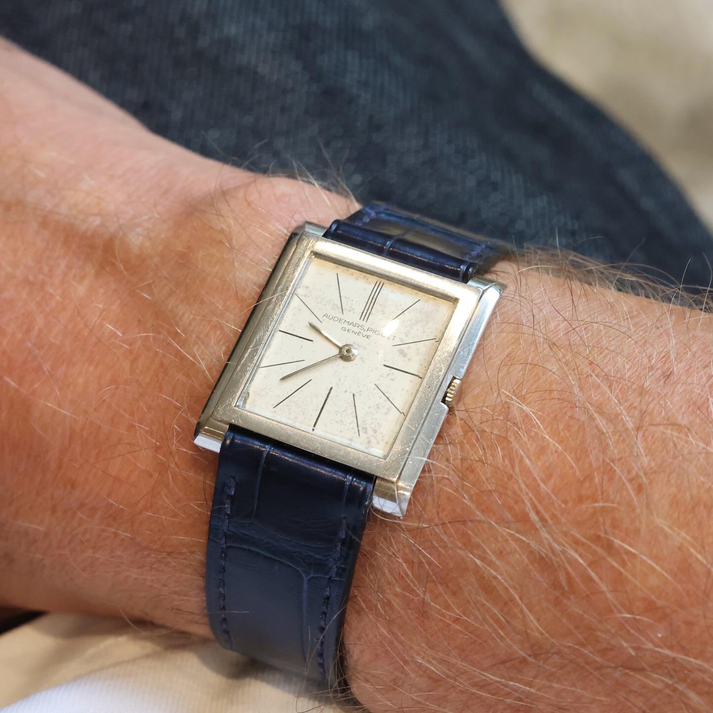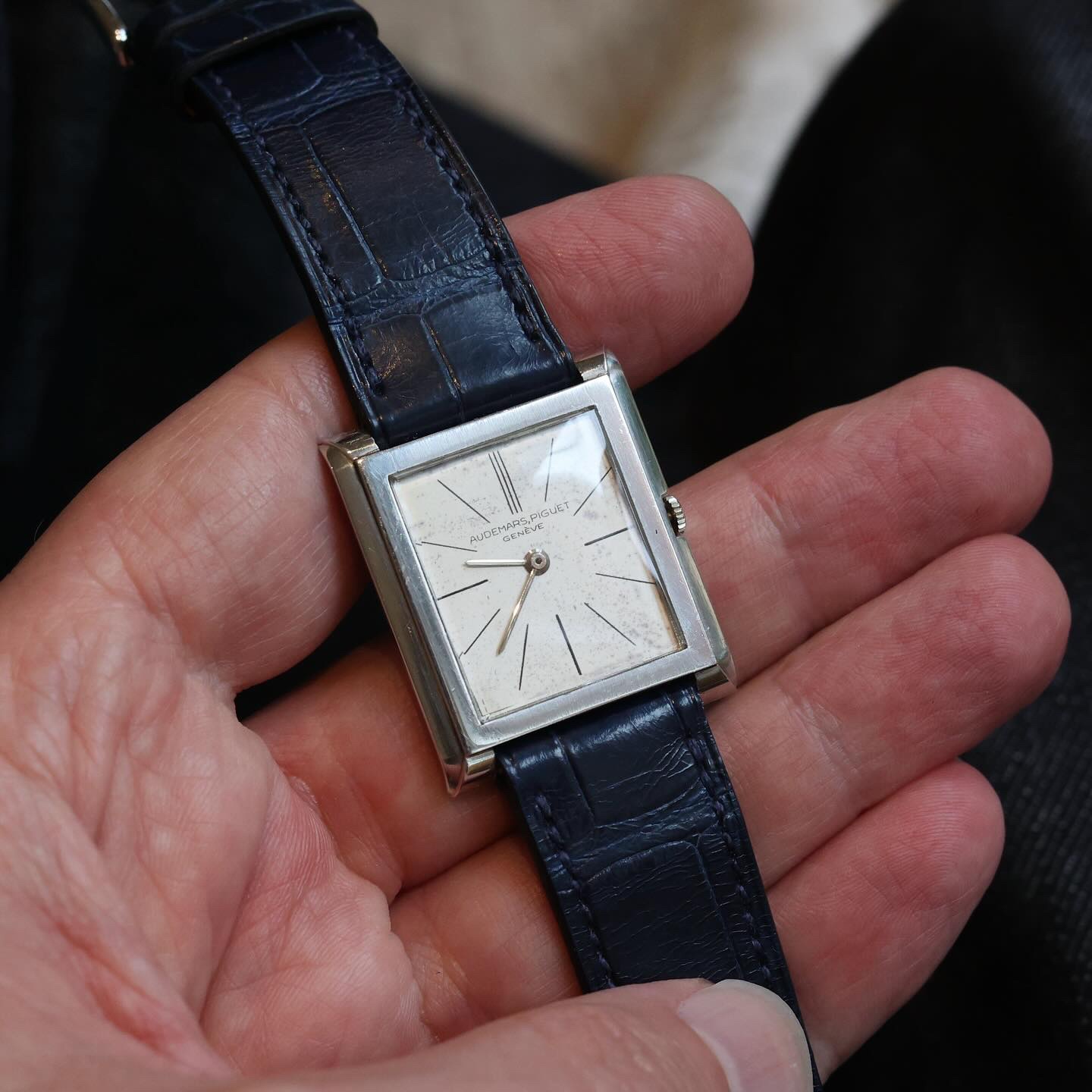 Rectangular platinum case (26 x 31 mm) with a very subtle design, hand-wound with the iconic ultra-thin calibre 2003, beautifully arrayed indexes (with a triple marker at 12): I love almost everything here.