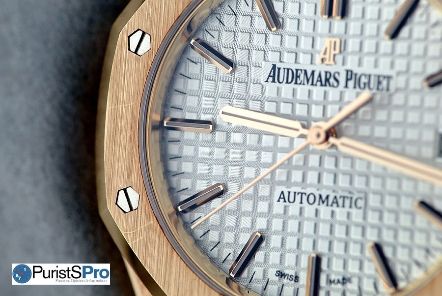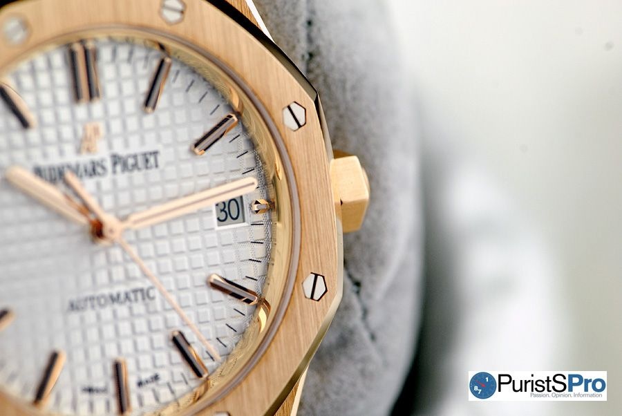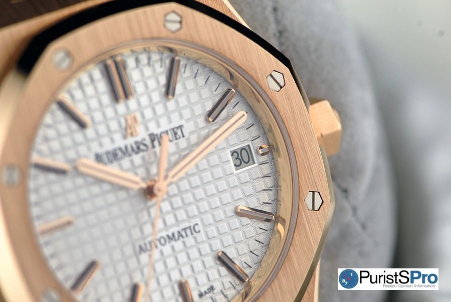 The pink gold version raises the watch’s sporty character to a whole new level of elegance and opulence. AP’s pink gold is simply beautiful with the perfect balance of warmth and richness. Its appearance varies depending on the type of light that surrounds it and the angle at which it hits the surface, illuminating all the edges and corners. The variations lend to the watch’s dynamic character.