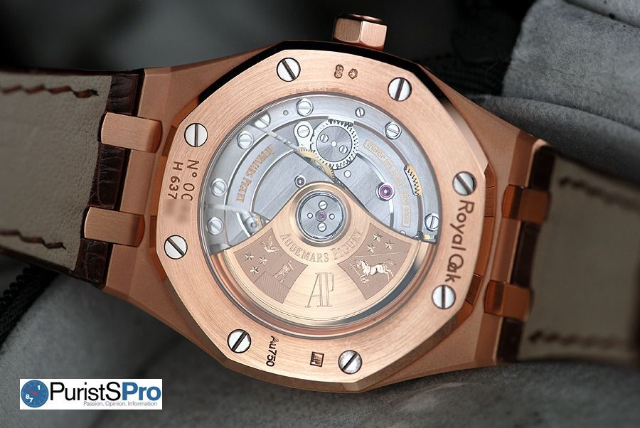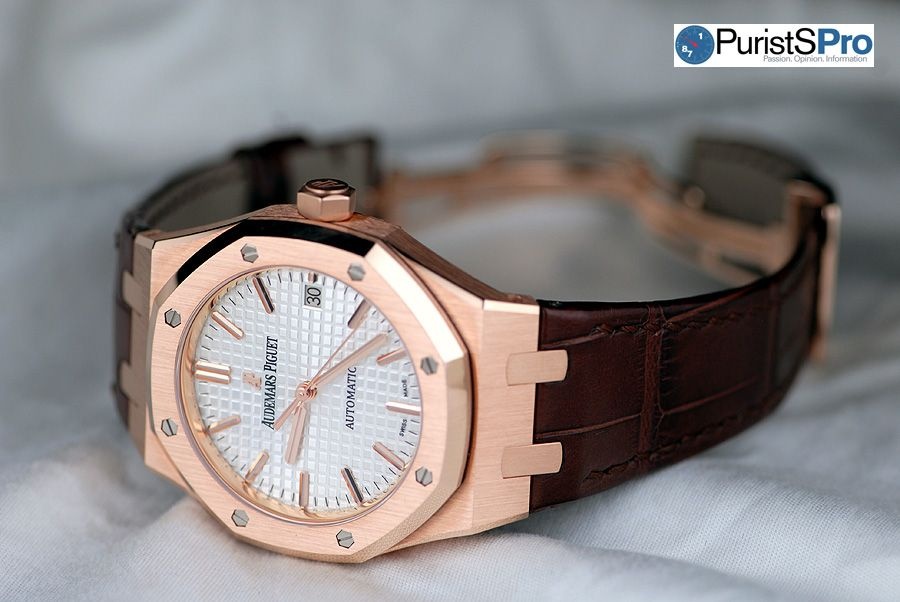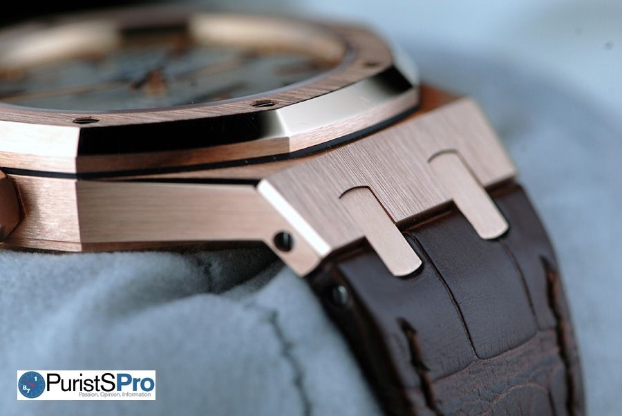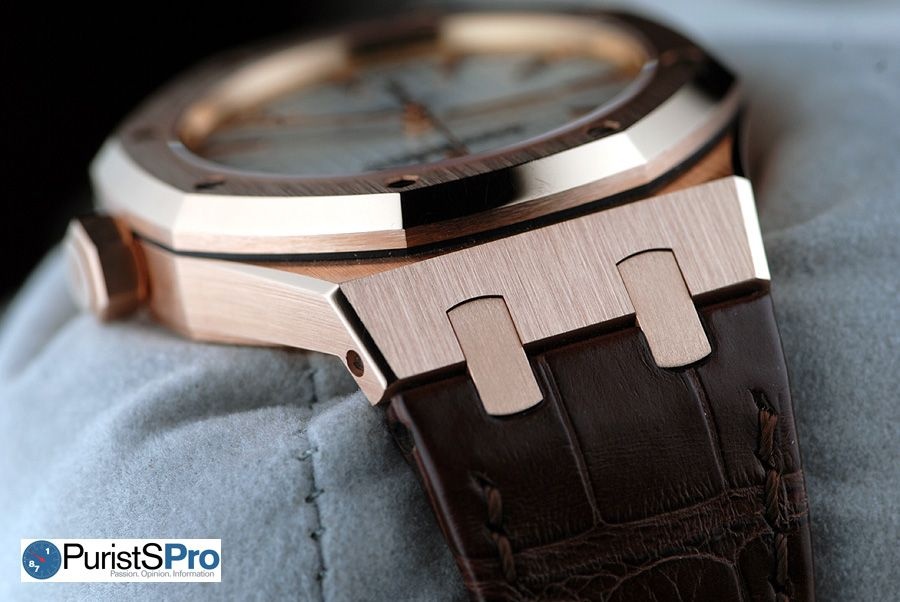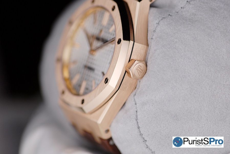 The 37mm Selfwinding Royal Oak in rose gold comes with a brown, hand-stitched "large square scale" crocodile strap with 18-carat pink gold AP folding clasp. The Royal Oak (and Offshore) isn’t an easy watch for people with small wrists to wear. Men with smaller wrists will now have the option of a smaller sized Royal Oak that may fit them better. Women with larger wrists will have the option of a larger “men’s” style watch in the 37mm Royal Oak.