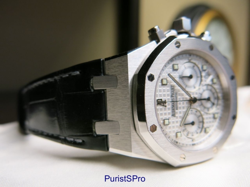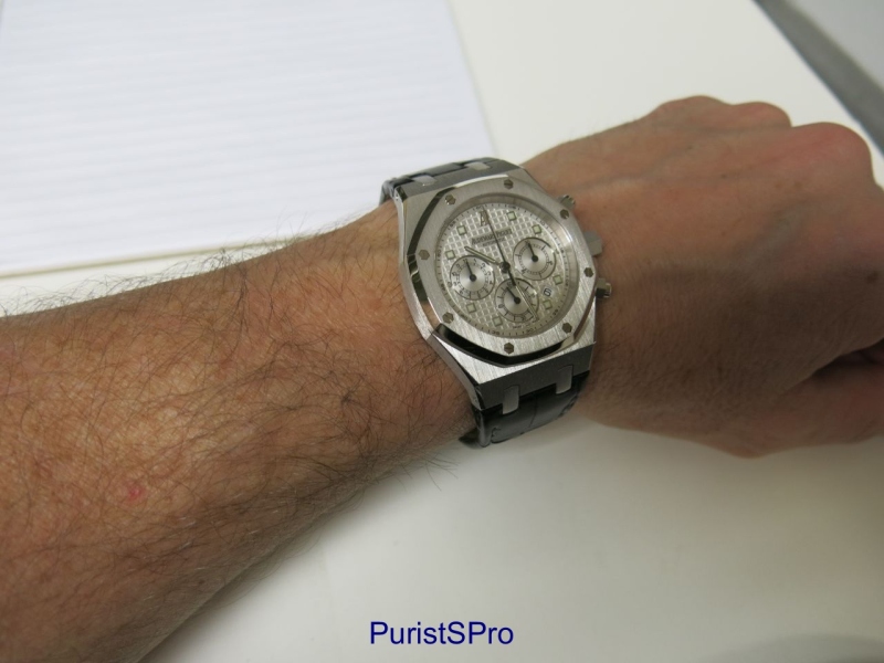 MichaelC showcases a discontinued Audemars Piguet Royal Oak Chronograph in white gold, drawing attention to its unique design elements and 39mm case size. This post sparks a discussion among collectors about the ideal dimensions and aesthetic details of the Royal Oak Chronograph, particularly in comparison to newer, larger references.